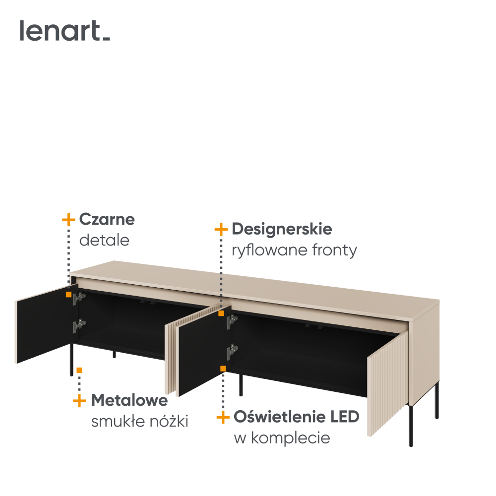 Szeroka szafka RTV w kolorze beżowym stanowi nowoczesny, stylowy akcent do każdego wnętrza, zapewniając jednocześnie dużą funkcjonalność i estetykę. Uwagę przyciąga przede wszystkim eleganckie, ryflowane wykończenie na frontach, które nadaje meblowi unikalny, przyciągający wzrok charakter. Dzięki szerokiej konstrukcji, szafka idealnie sprawdzi się jako centrum multimedialne, dodając wnętrzu wyjątkowego stylu i harmonii.