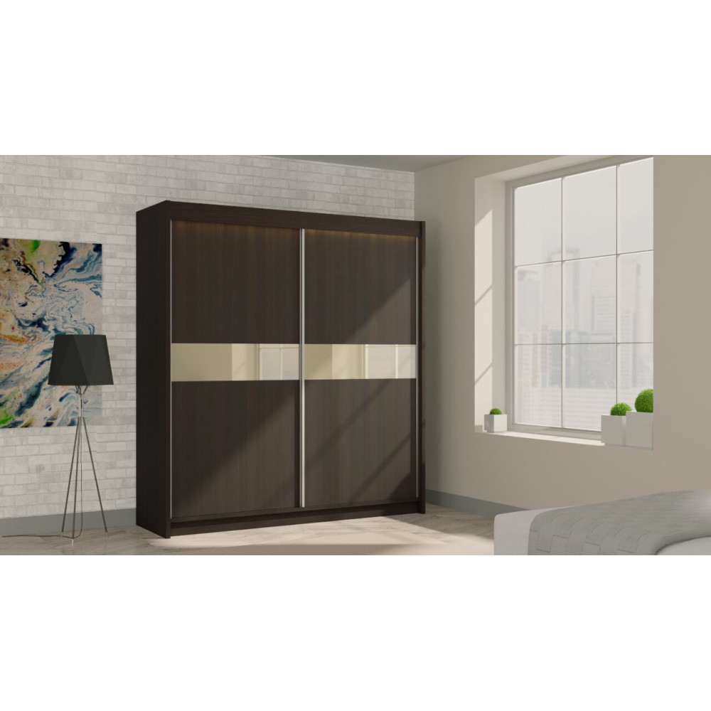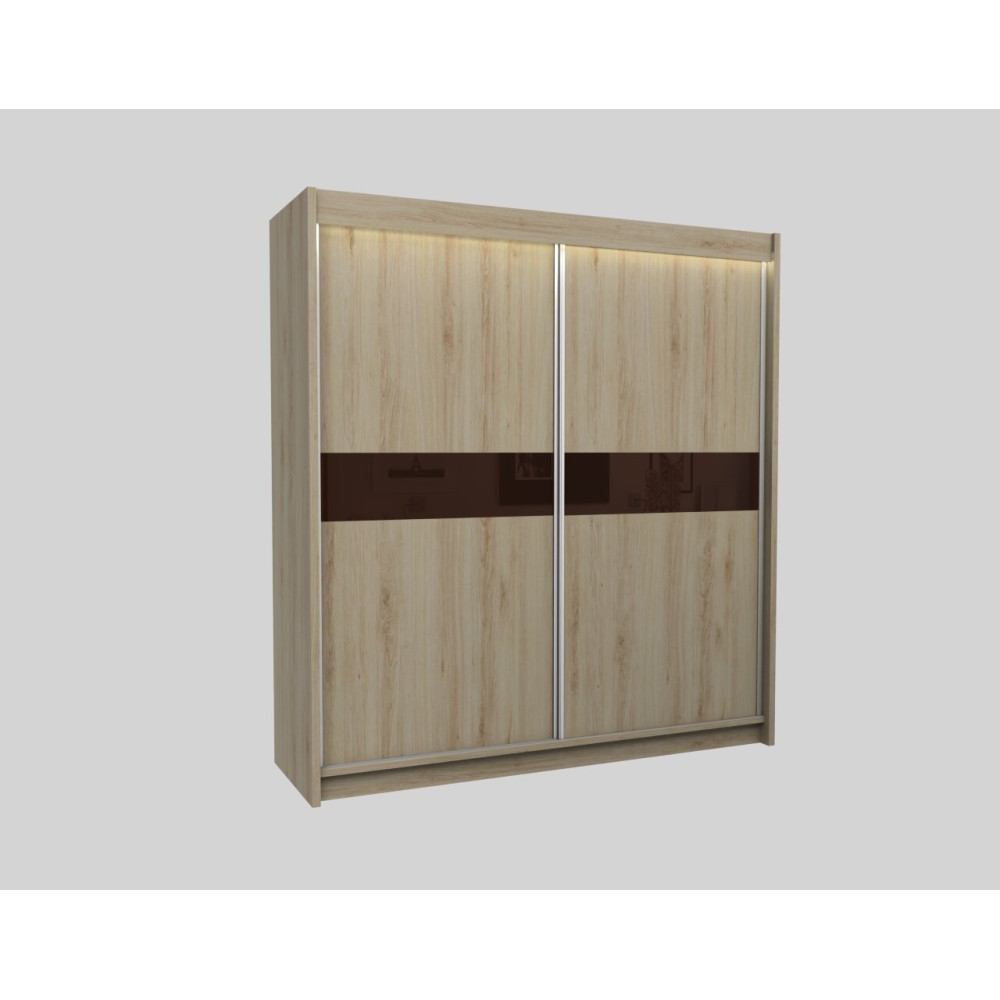 Szafa przesuwna z płyty laminowanej 16 mm. Szafa wyposażona jest w system jezdny zawierający aluminiowe prowadnice typu LAGUNA oraz kółka ułożyskowane