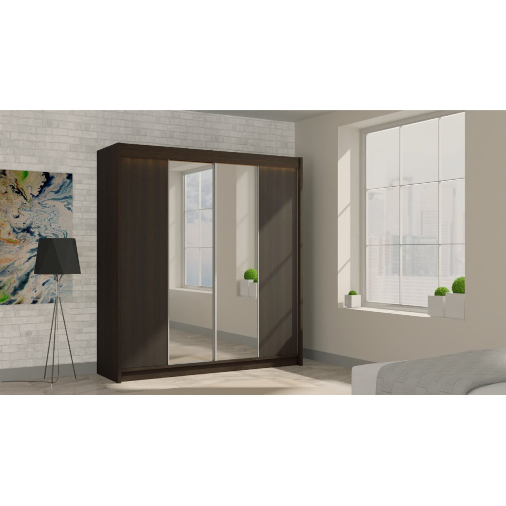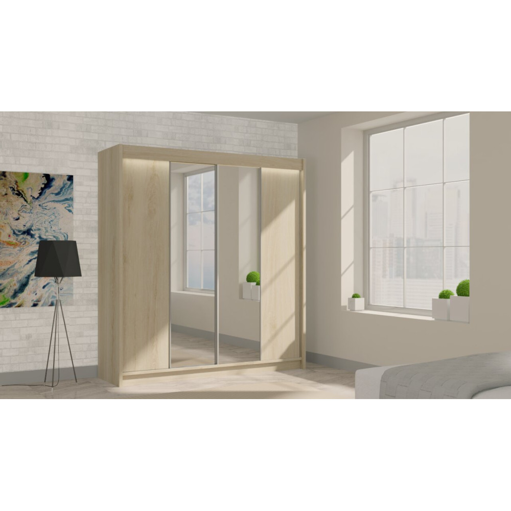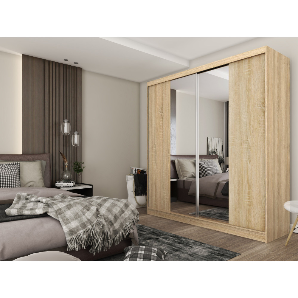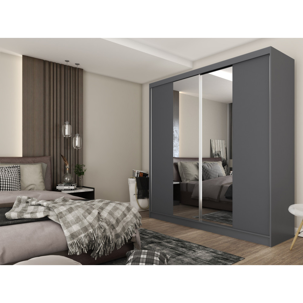 Szafa przesuwna z płyty laminowanej 16 mm. Szafa wyposażona jest w system jezdny zawierający aluminiowe prowadnice typu LAGUNA oraz kółka ułożyskowane
