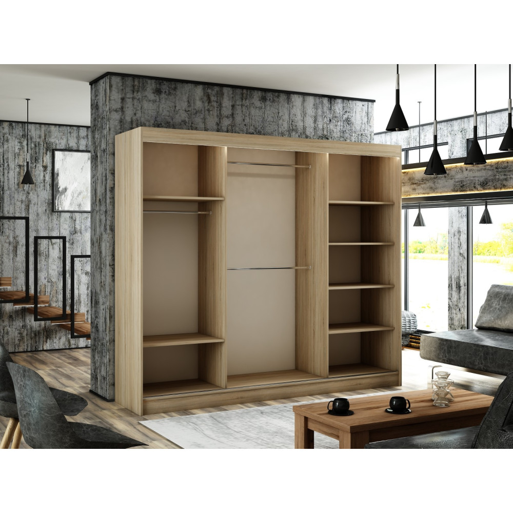 Szafa przesuwna z płyty laminowanej 16 mm. Szafa wyposażona jest w system jezdny zawierający aluminiowe prowadnice typu LAGUNA oraz kółka ułożyskowane