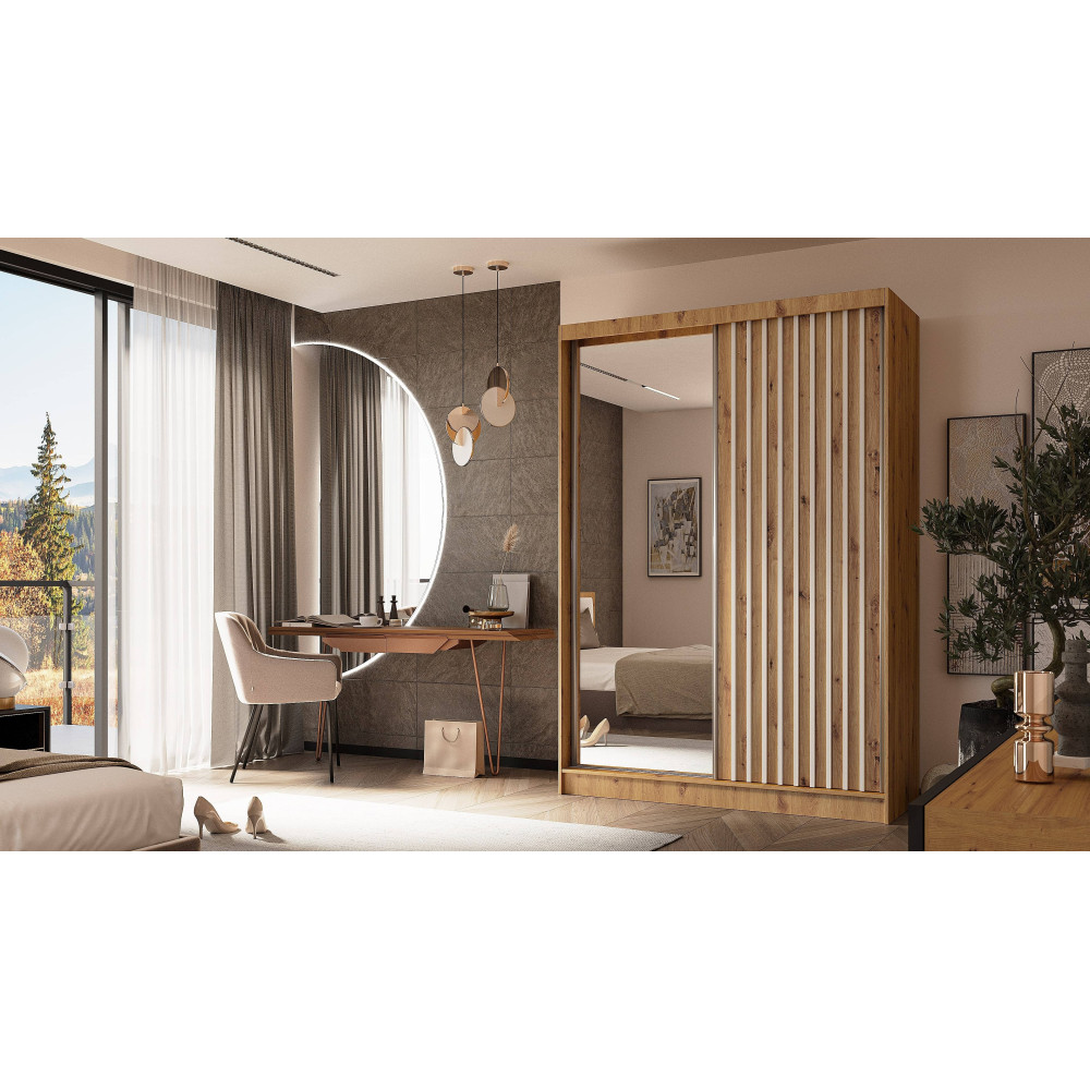 W skład zestawu wchodzą: korpus, półki, drążek, zestaw montażowy, fronty lustro + lamele(9szt)