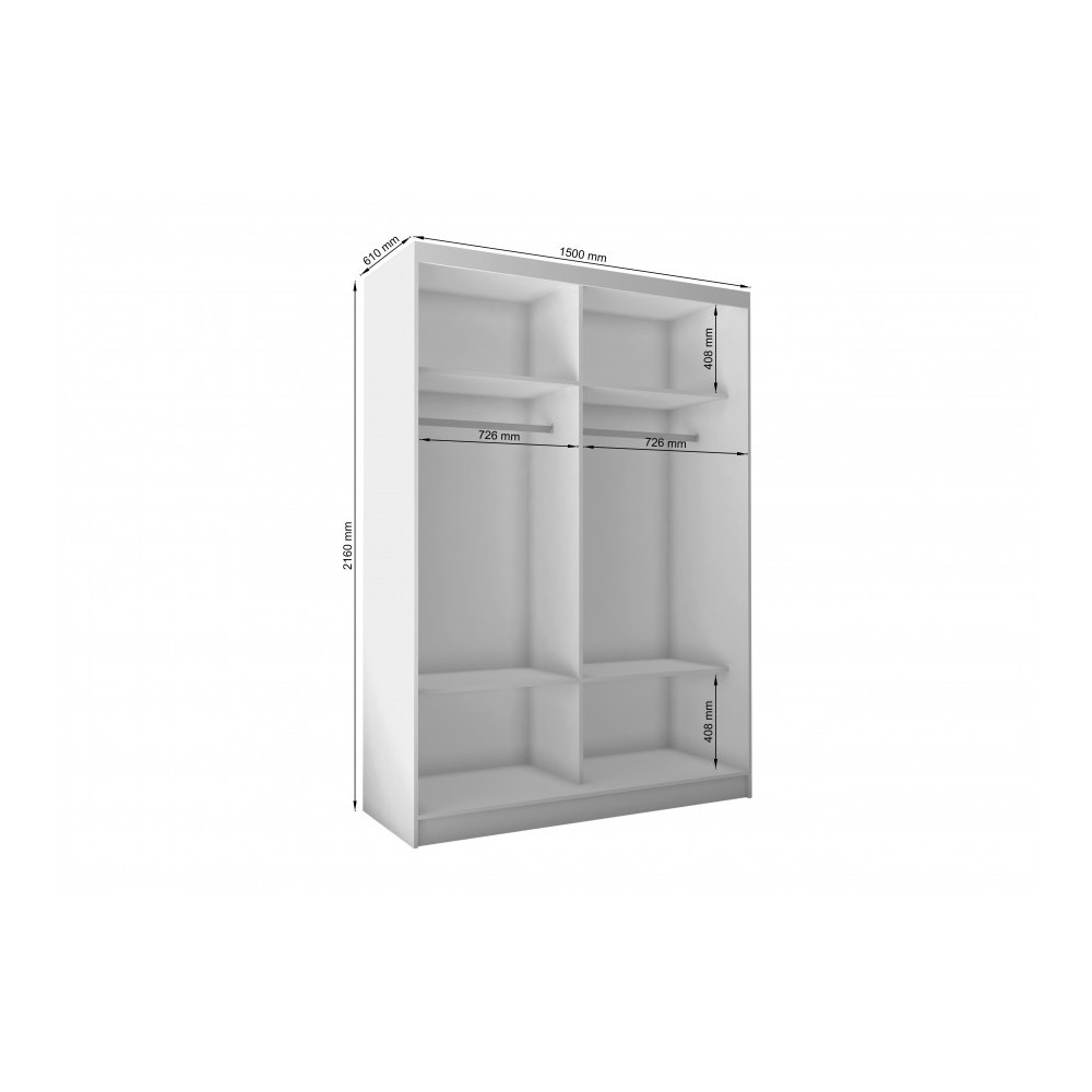 Szafa przesuwna z płyty laminowanej 16 mm. Szafa wyposażona jest w system jezdny zawierający aluminiowe prowadnice typu LAGUNA oraz kółka ułożyskowane