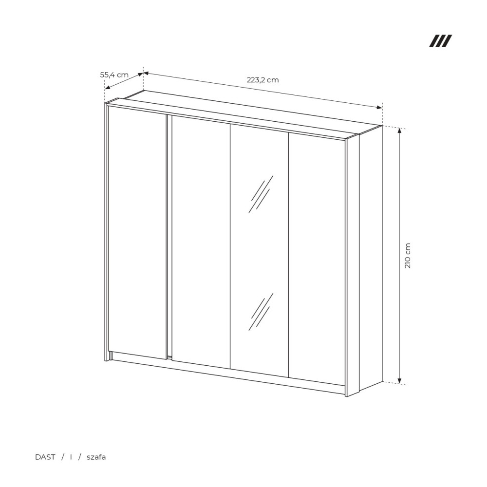 Wymiary: szerokość 223,2 cm / wysokość 210 cm / głębokość 55,4 cm.