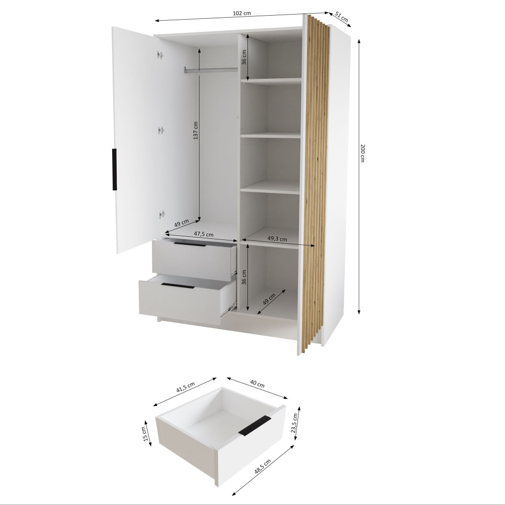 W skład zestawu wchodzą: korpus, front z lustrem, front ryflowany, 2x szuflada, drążek ubraniowy, 4x półka, zestaw montażowy, uchwyty.