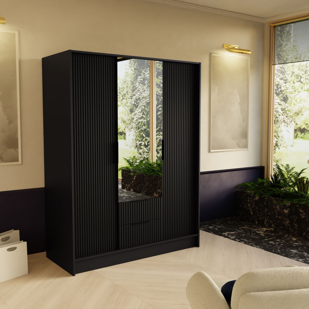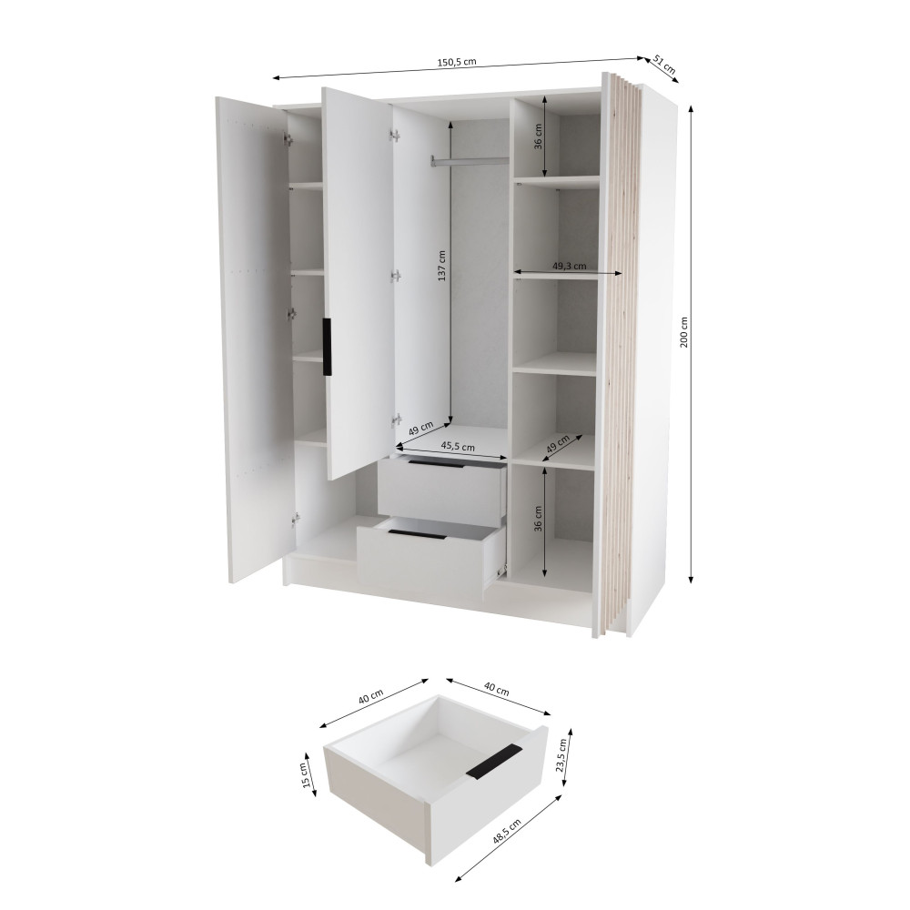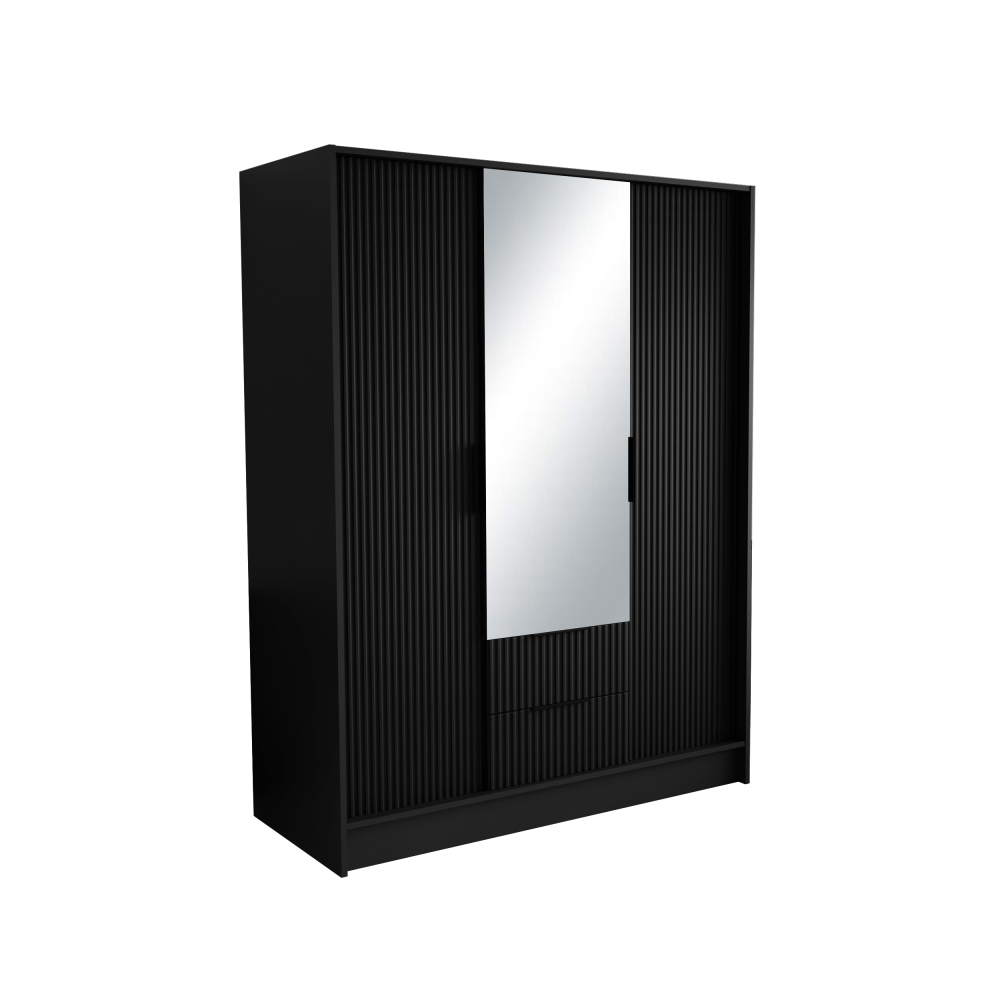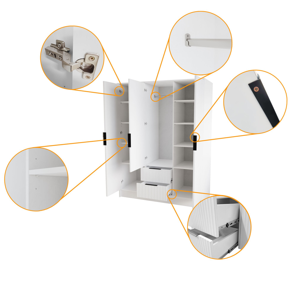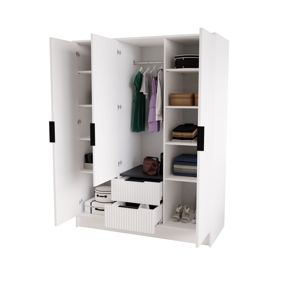 W skład zestawu wchodzą: korpus, front z lustrem, 2x front ryflowany, 2x szuflada, drążek ubraniowy, 8x półka, zestaw montażowy, uchwyty.