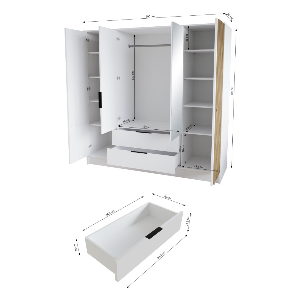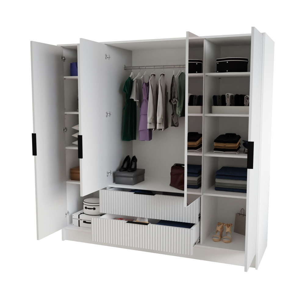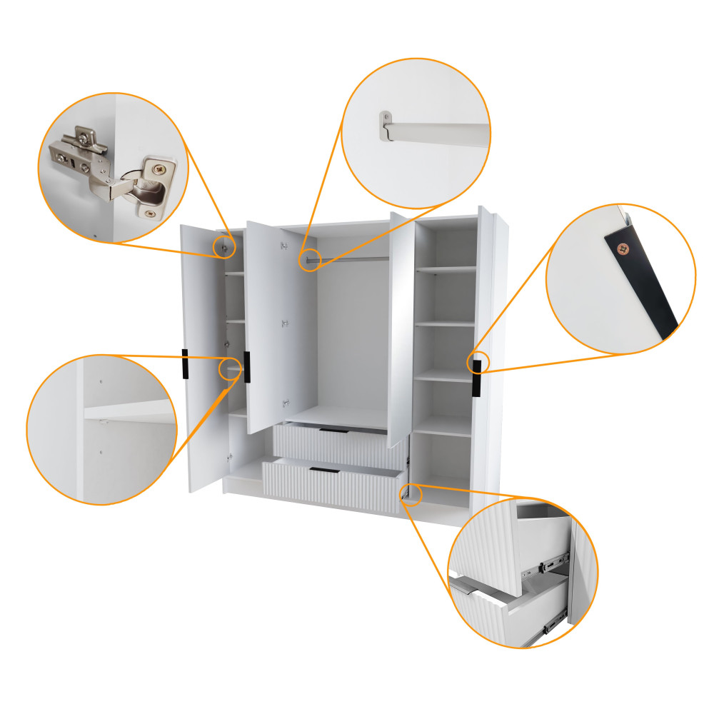 W skład zestawu wchodzą: korpus, 2x front z lustrem, 2x front ryflowany, 2x szuflada, drążek ubraniowy, 8x półka, zestaw montażowy, uchwyty.