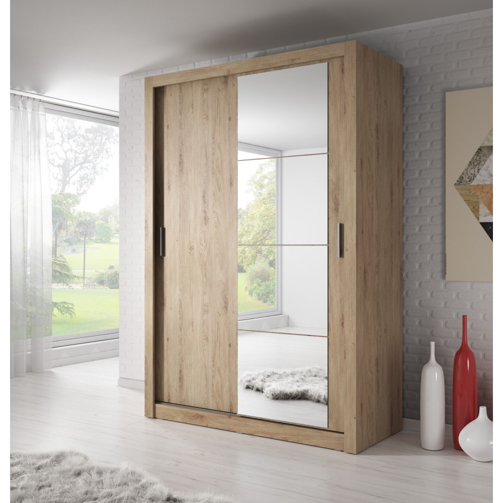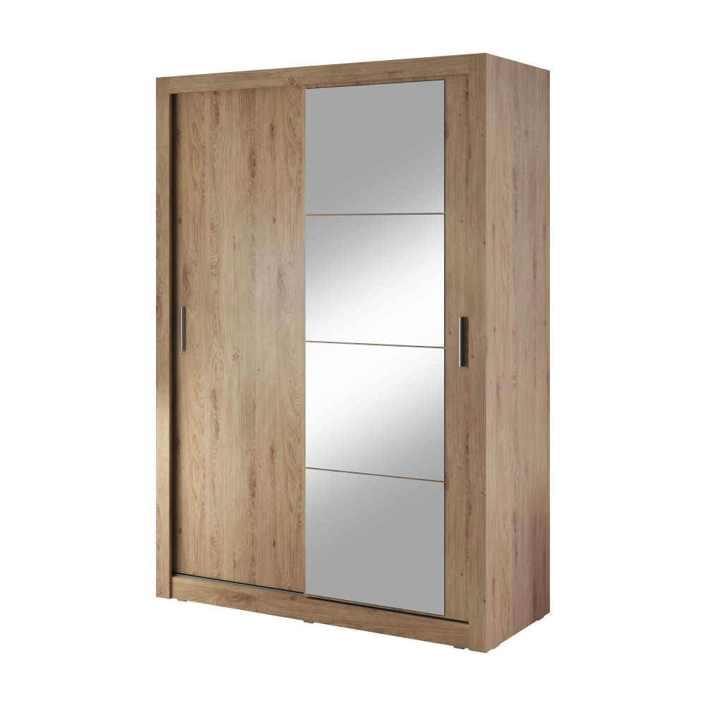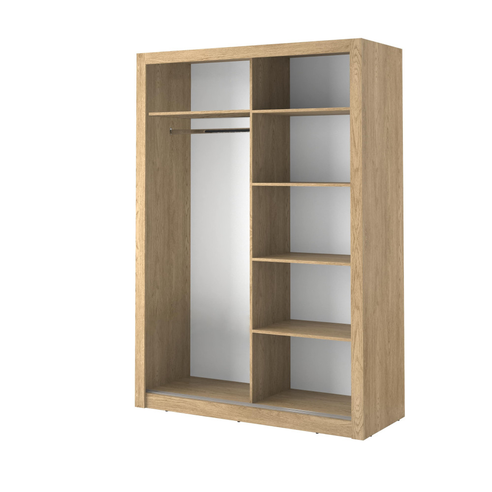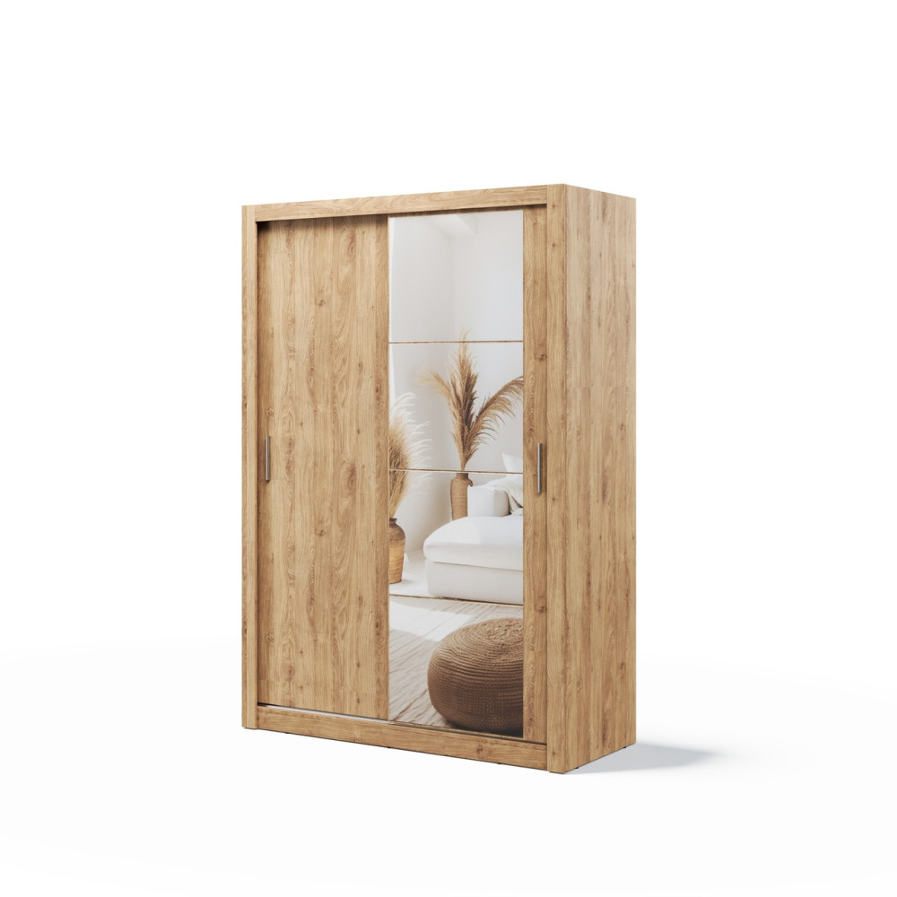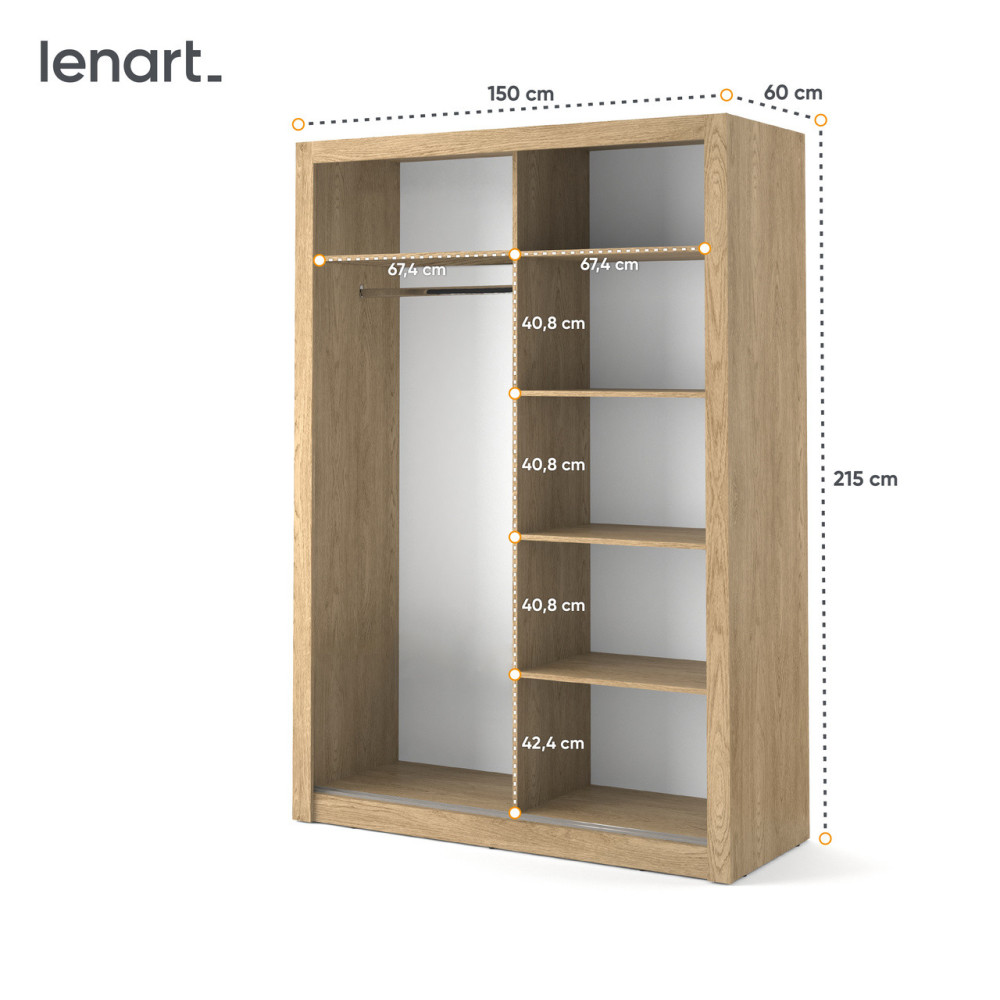 Kompaktowa, wąska szafa dwudrzwiowa to idealne rozwiązanie do mniejszych wnętrz. Lustro dzielone umieszczone na jednym froncie drzwi optycznie powiększa przestrzeń, dodając wnętrzu lekkości i jasności. Szafa wykonana jest z wytrzymałej płyty laminowanej, a krawędzie zabezpieczono trwałym obrzeżem ABS, co zapewnia jej długą żywotność i odporność na uszkodzenia. Dostępna w eleganckich kolorach: dąb shetland, białym, szarym i czarnym doskonale wpasuje się w różne style aranżacji. Opcjonalnie dostępne dwupunktowe oświetlenie LED-2SP w białej barwie dodatkowo podkreśli nowoczesny charakter mebla i umożliwi wygodne korzystanie z szafy nawet wieczorem.