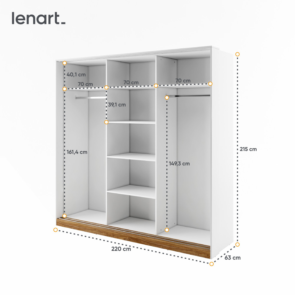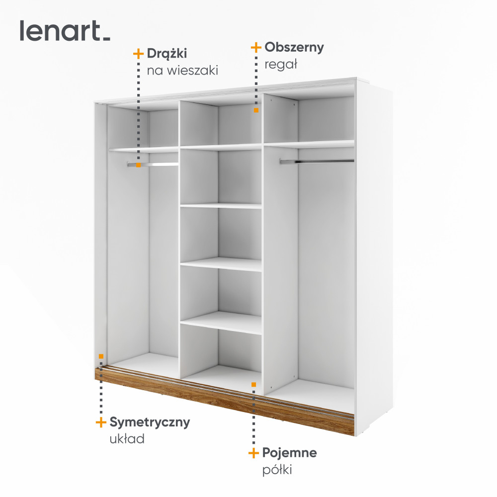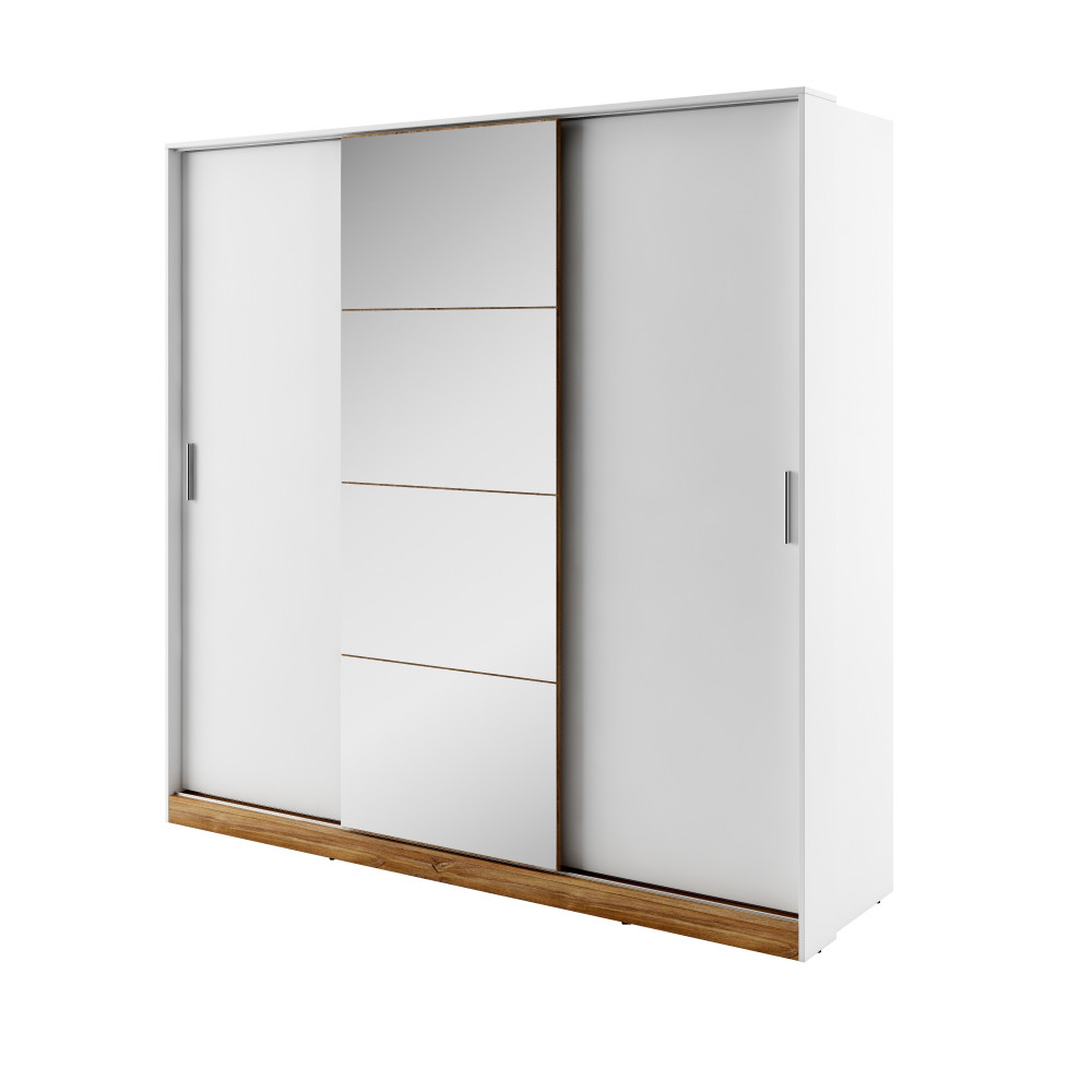 Nowoczesna i wyjątkowo pojemna szafa z trzema przesuwnymi drzwiami. Na jednych z nich znajdują się lustra optycznie powiększające przestrzeń. Wyposażona w dwa drążki na wieszaki oraz regał z półkami, idealna do przechowywania ubrań. Mebel wykonany jest w kolorze białym i dąb stirling. Szafa ma symetryczną konstrukcję i jest stworzona z wytrzymałej płyty laminowanej, wykończonej trwałym obrzeżem ABS. Istnieje możliwość uzupełnienia jej o dwupunktowe, energooszczędne oświetlenie LED-2S.