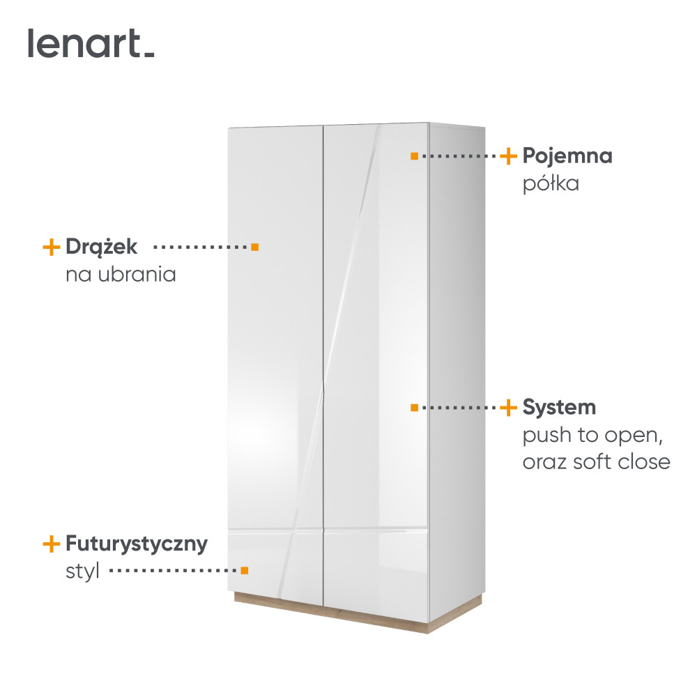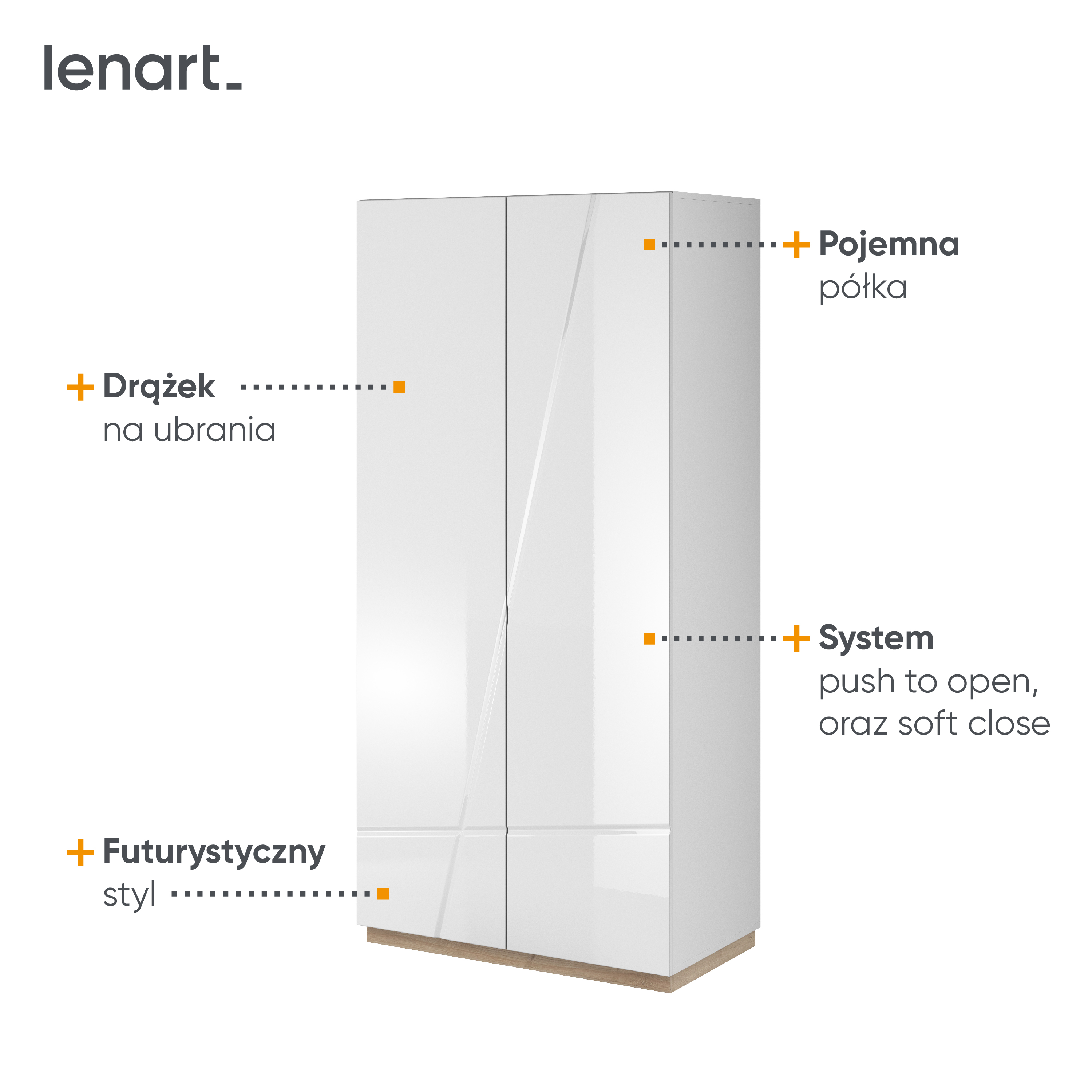 Dzięki systemom push to open i soft close, drzwi otwierają się bez uchwytów i zamykają się cicho oraz płynnie. Wewnątrz szafa wyposażona jest w drążek na ubrania, zapewniając wygodną przestrzeń do przechowywania garderoby. To połączenie zaawansowanej technologii z nowoczesnym stylem.