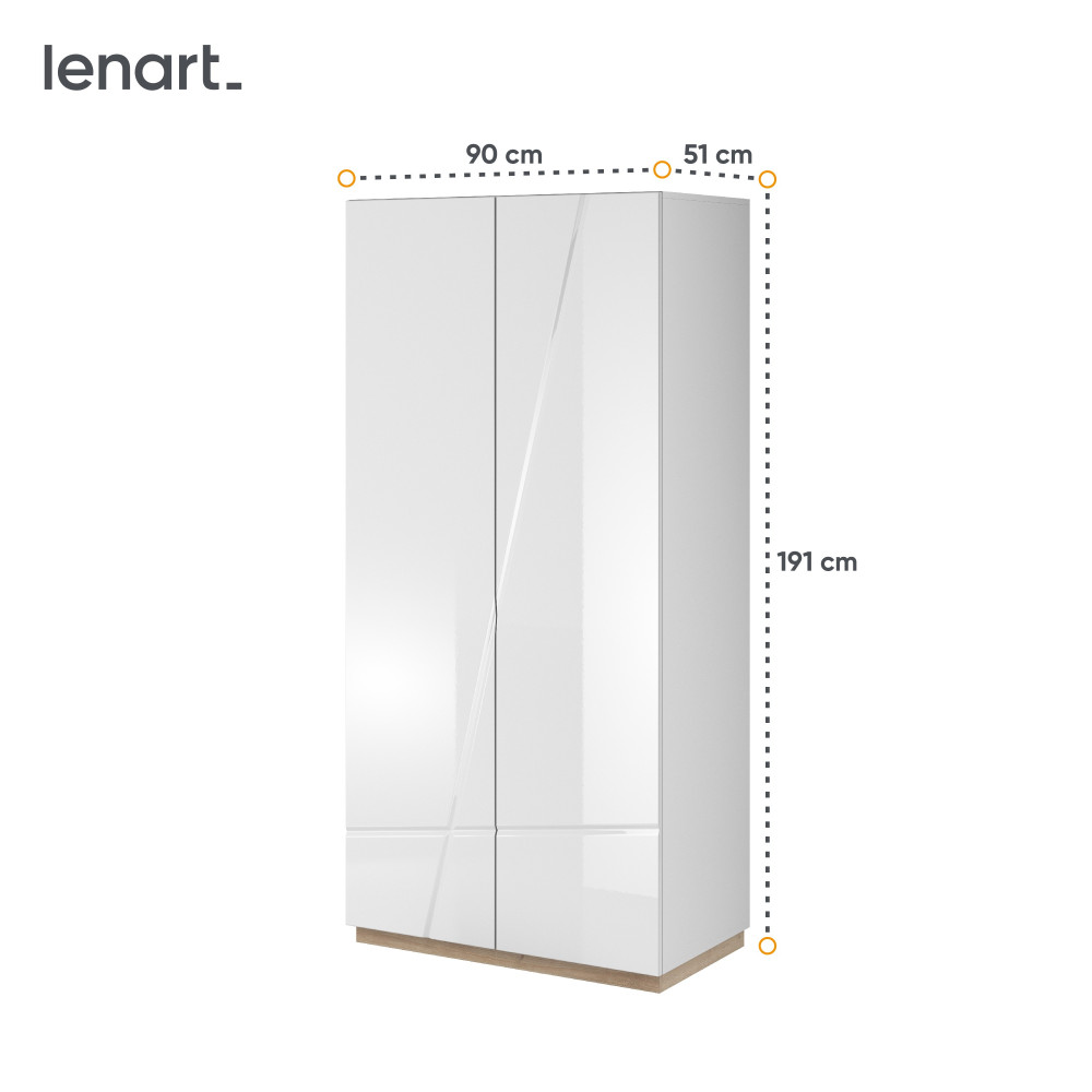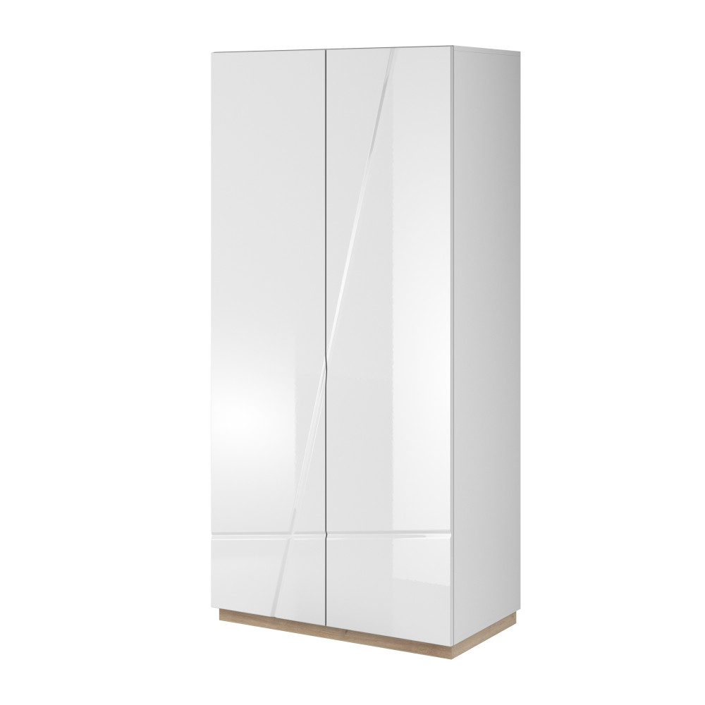 Szafa dwudrzwiowa w futurystycznym stylu łączy nowoczesną estetykę z funkcjonalnością. Wyróżnia się połyskującą bielą z subtelnymi akcentami drewna w kolorze dąb Riviera. To elegancka propozycja, która doskonale wpisuje się w minimalistyczne i nowoczesne wnętrza.