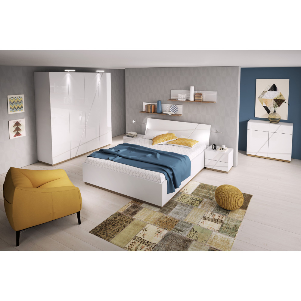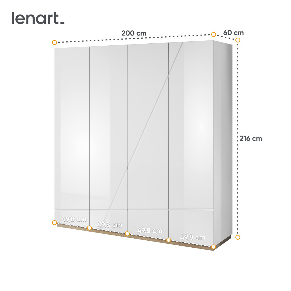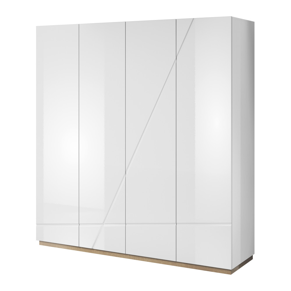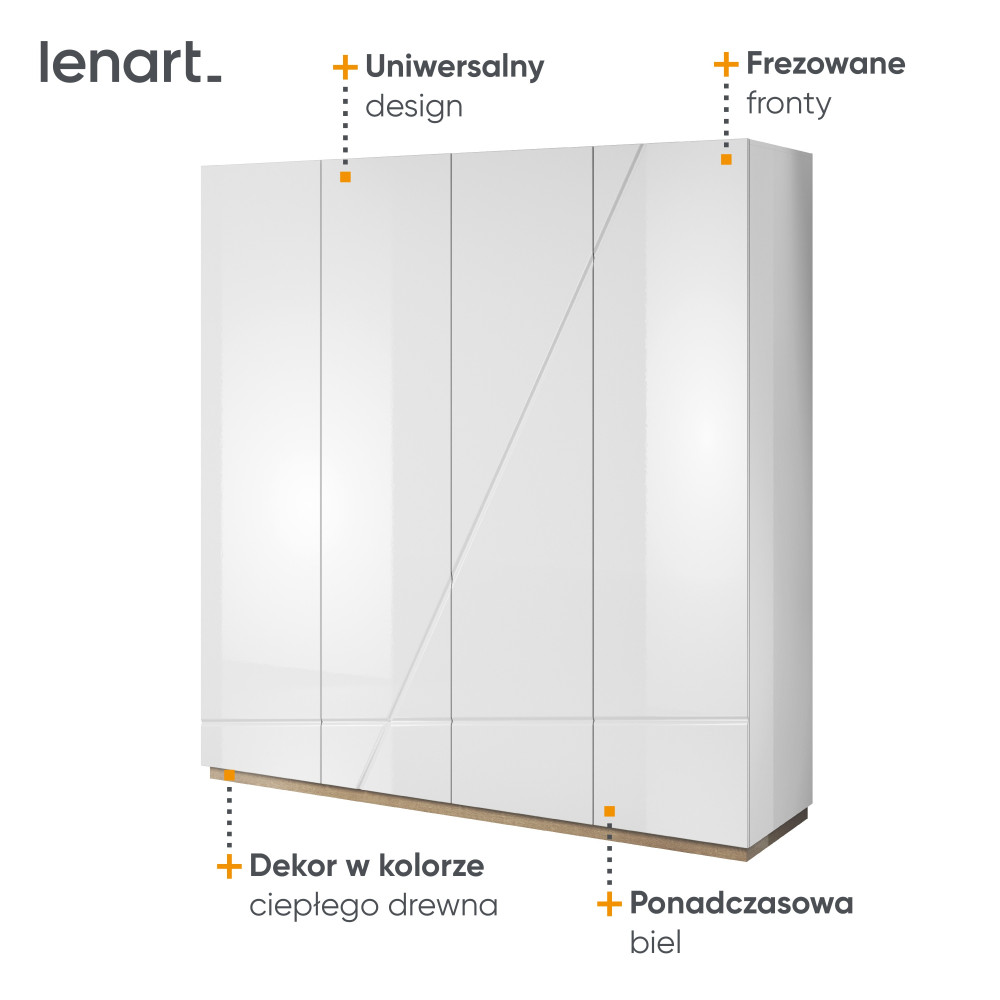 Szafa czterodrzwiowa w ponadczasowym stylu łączy nowoczesną estetykę z wysoką funkcjonalnością. Wyróżnia się połyskującą bielą oraz subtelnymi akcentami drewna w kolorze dąb Riviera, co nadaje jej elegancji. To idealna propozycja do minimalistycznych, nowoczesnych wnętrz, oferująca dużo przestrzeni do przechowywania i stylowy wygląd.