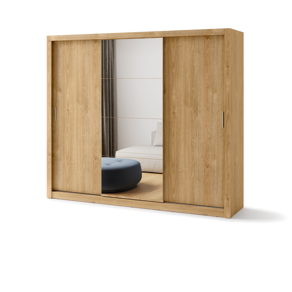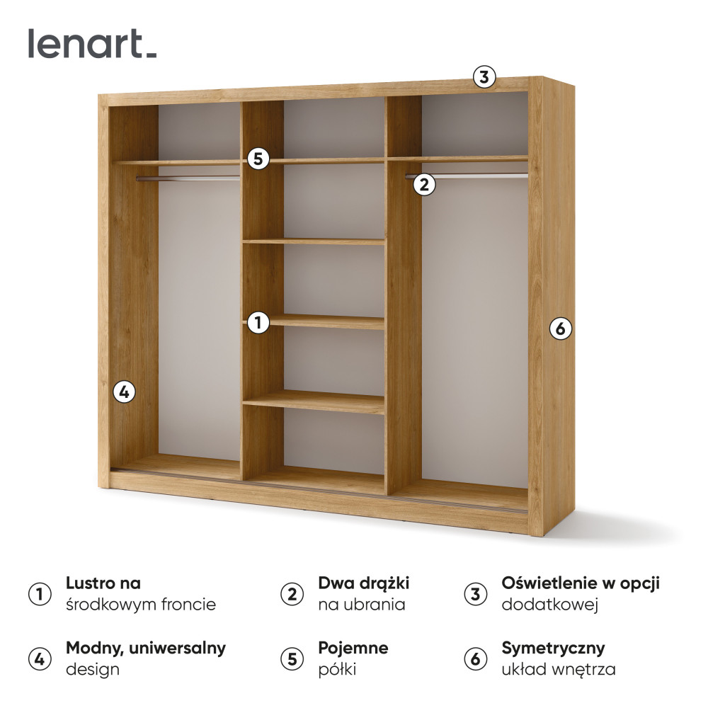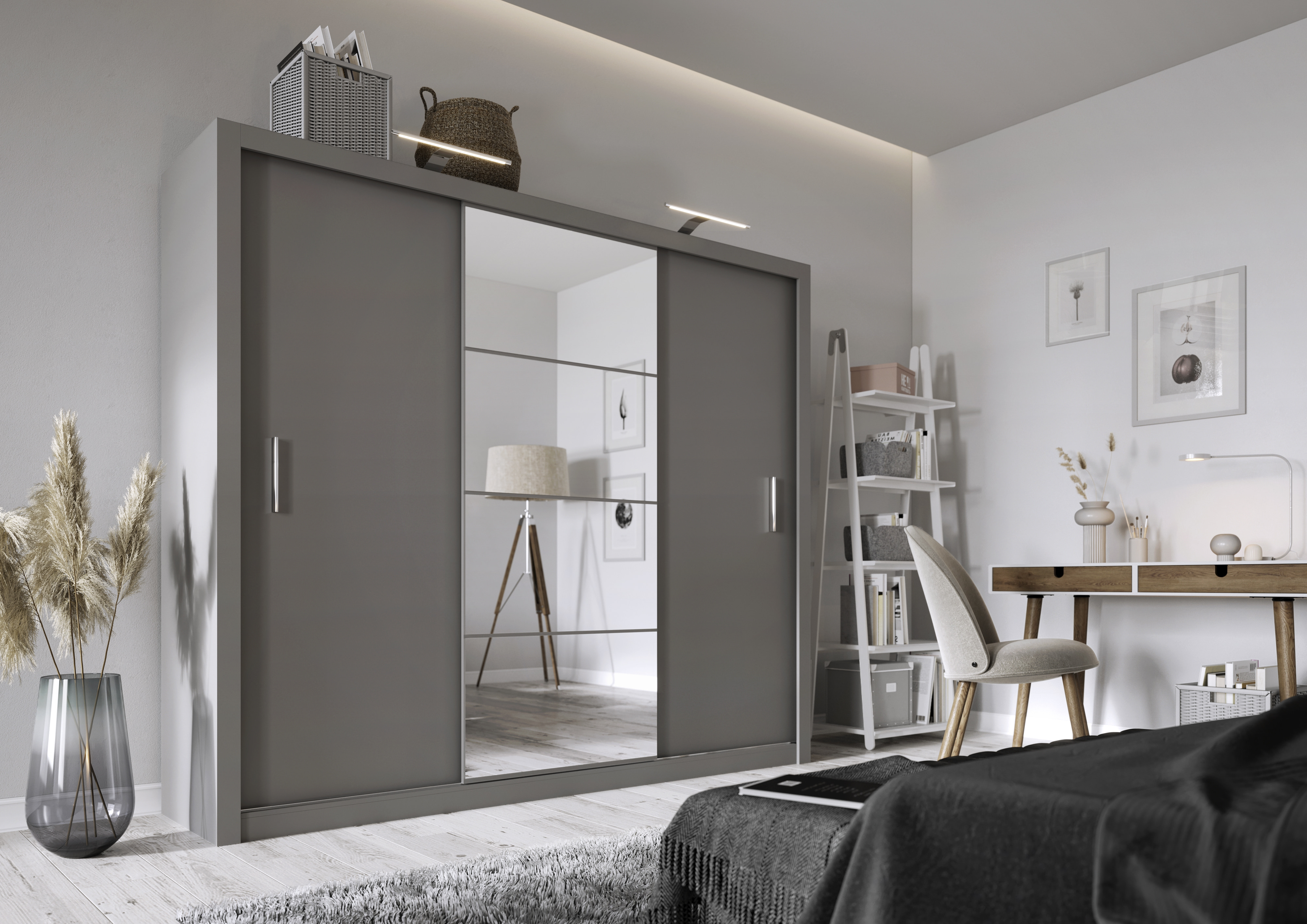 Przestronna i funkcjonalna szafa z trzema przesuwnymi drzwiami, wyposażona w lustra, które optycznie powiększają przestrzeń. Wnętrze szafy zawiera dwa drążki na wieszaki oraz pojemne półki, oferując dużo miejsca na przechowywanie. Szafa jest dostępna w czterech eleganckich kolorach: biały, dąb shetland, san remo oraz szary, co pozwala dopasować ją do różnych stylów wnętrz.