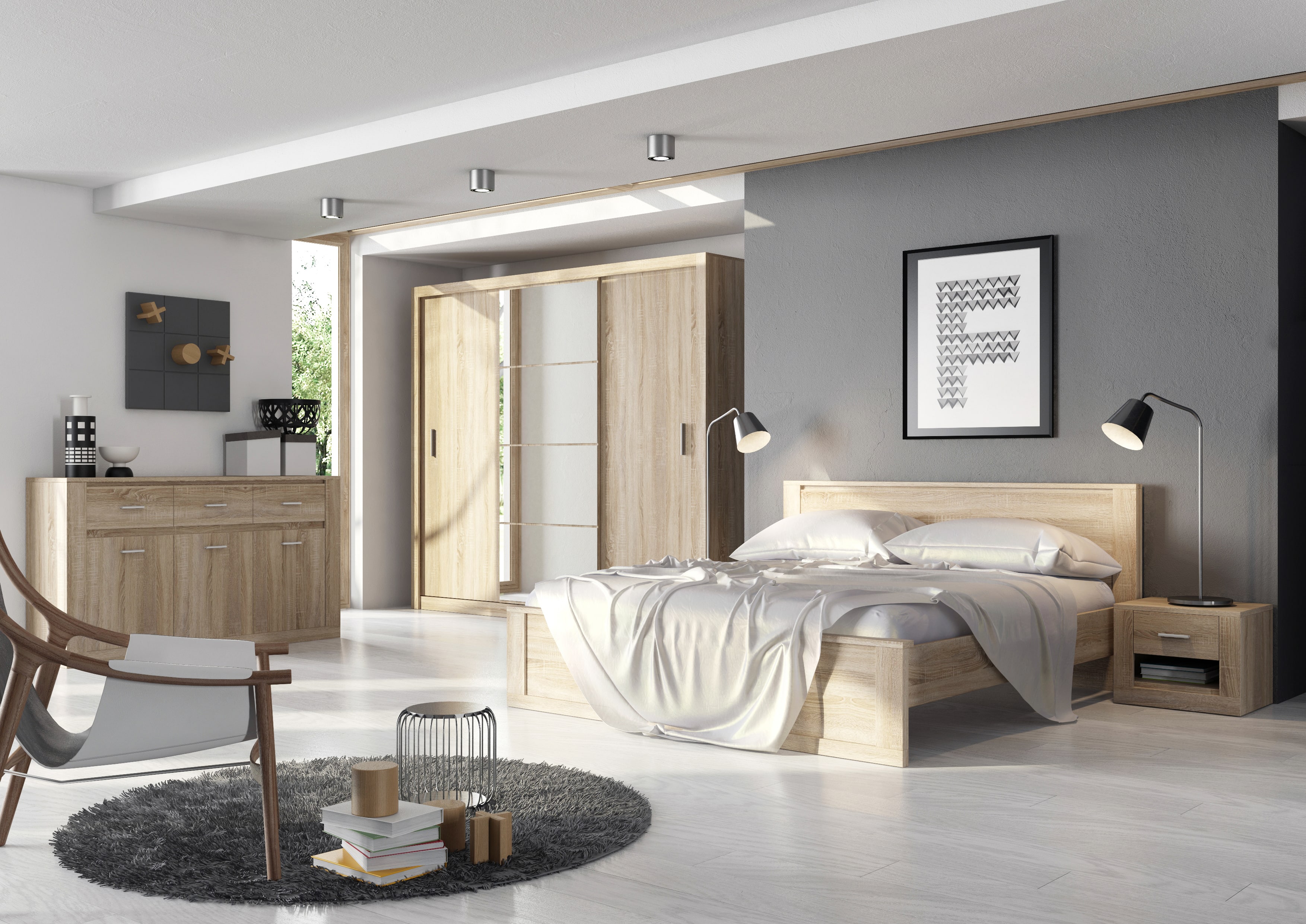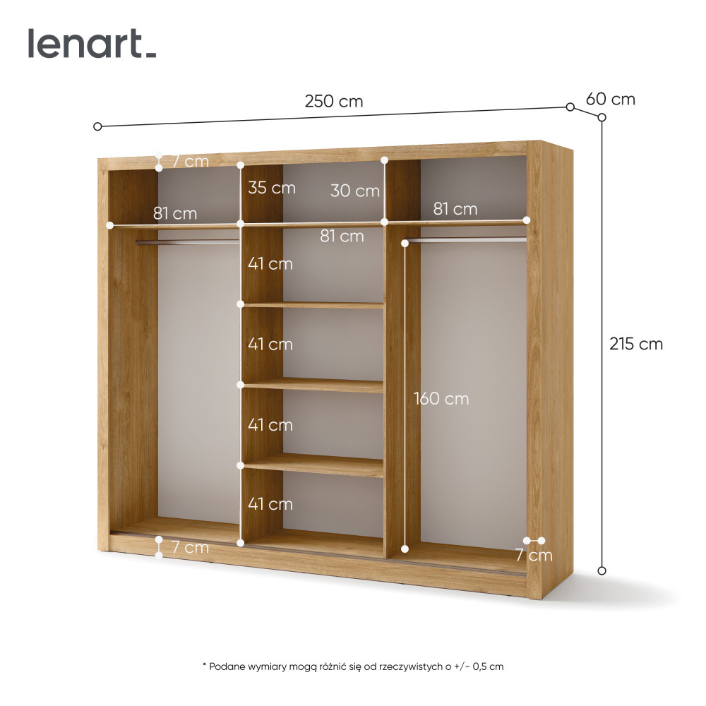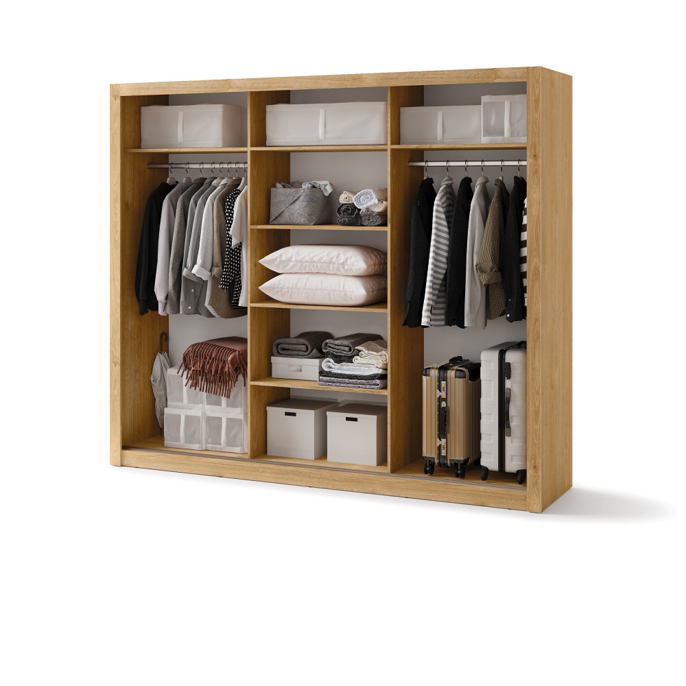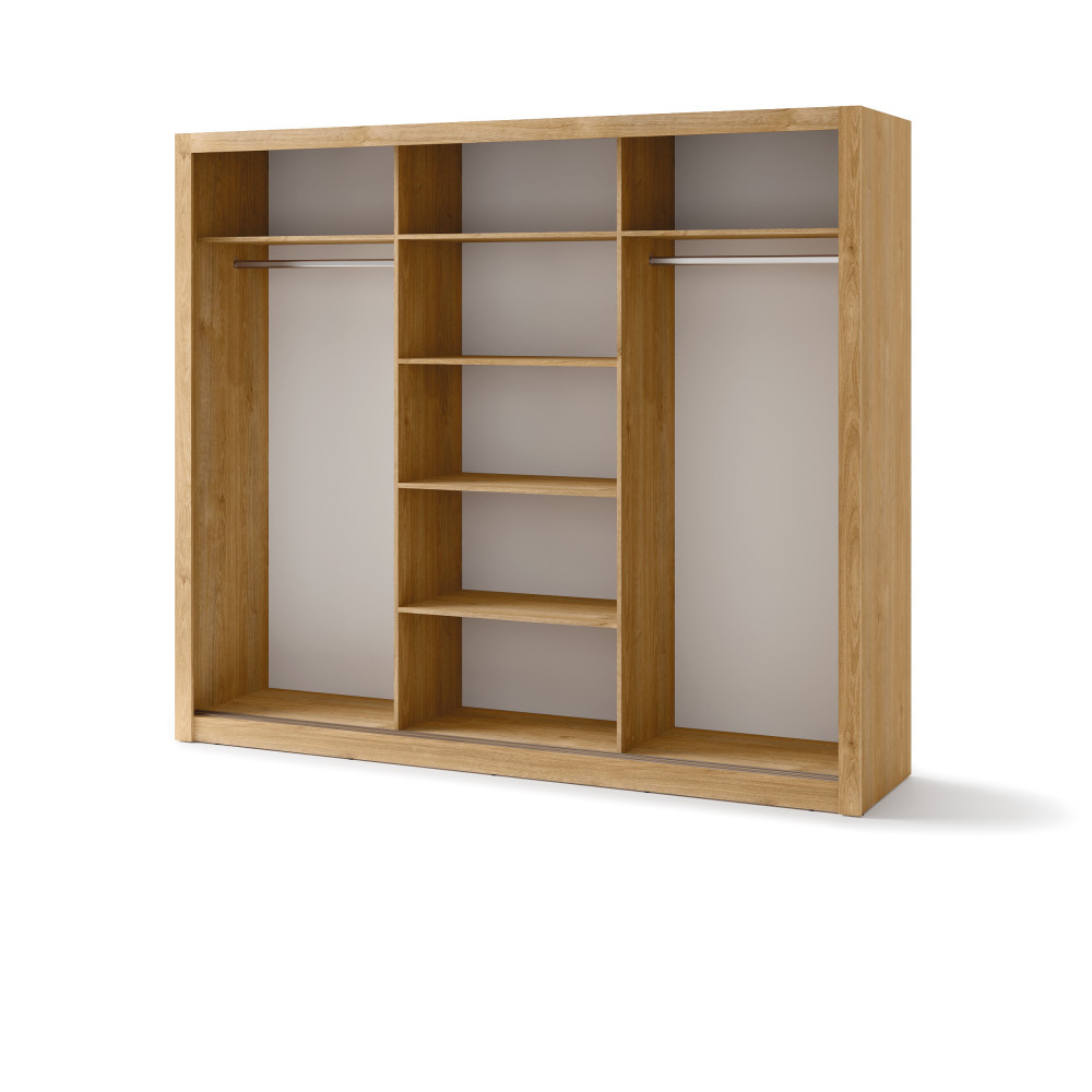 Przestronna i funkcjonalna szafa z trzema przesuwnymi drzwiami, wyposażona w lustra, które optycznie powiększają przestrzeń. Wnętrze szafy zawiera dwa drążki na wieszaki oraz pojemne półki, oferując dużo miejsca na przechowywanie. Szafa jest dostępna w czterech eleganckich kolorach: biały, dąb shetland, san remo oraz szary, co pozwala dopasować ją do różnych stylów wnętrz.