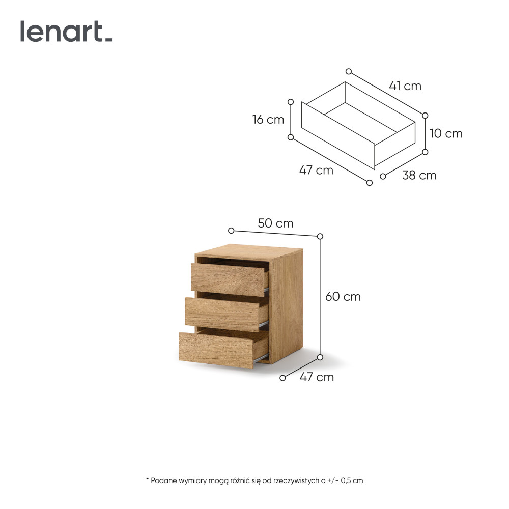 Dodatkowo istnieje możliwość skompletowania szafy z kontenerkiem lub/i oświetleniem LED.  Mebel został wykonany z solidnej płyty laminowanej, zabezpieczonej wytrzymałym obrzeżem ABS, co zapewnia długą trwałość.