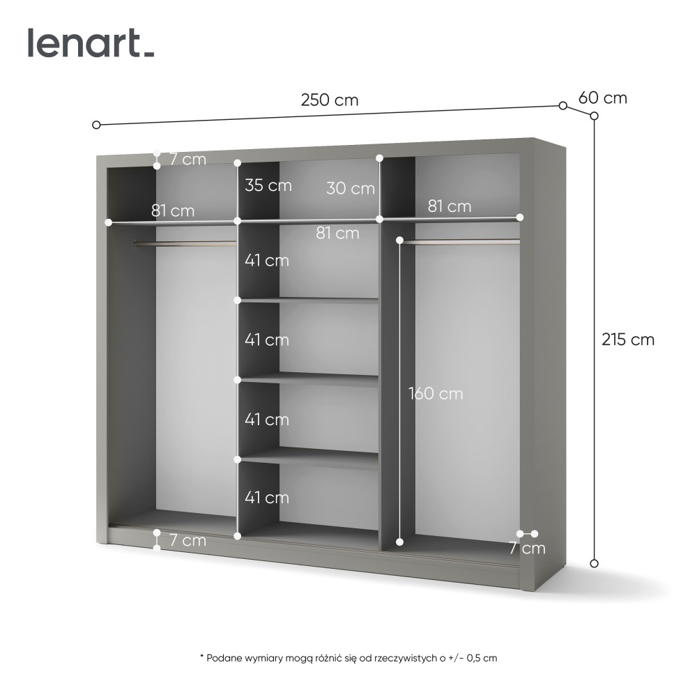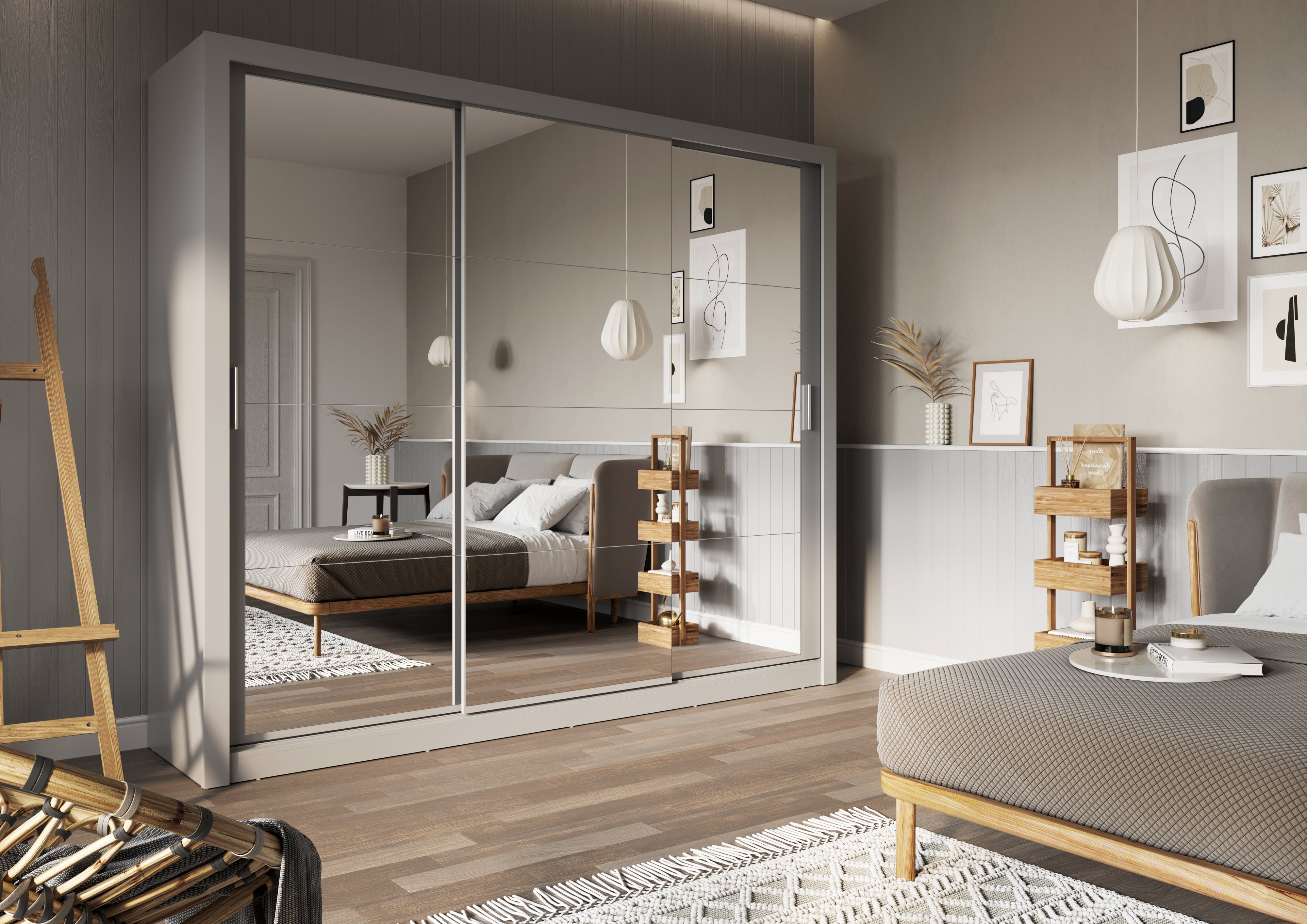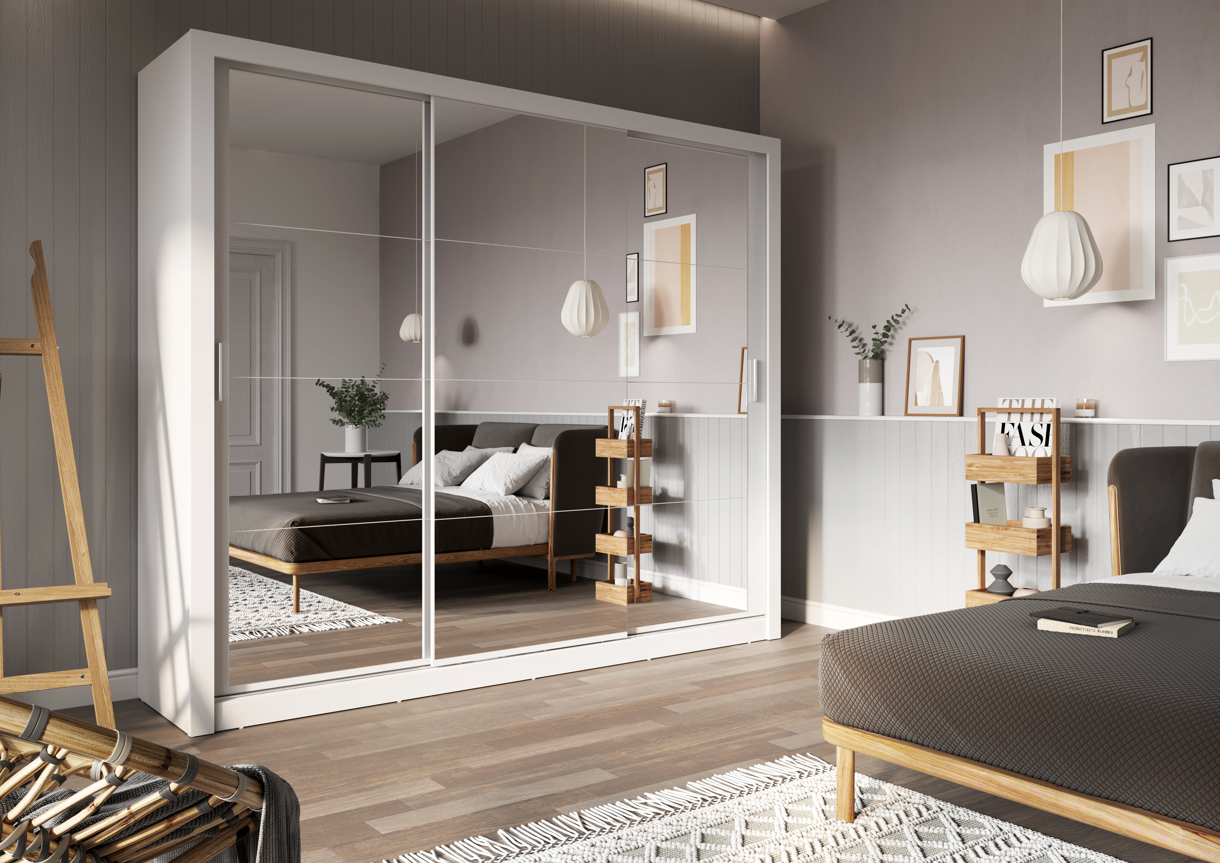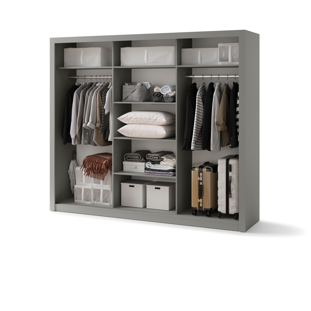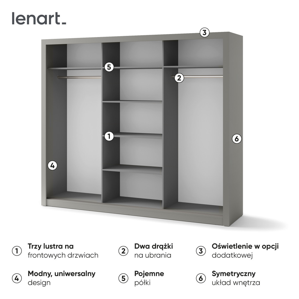 Szafa z trojgiem drzwi przesuwnych to funkcjonalne rozwiązanie do każdego wnętrza. Wnętrze mebla wyposażone jest w dwa drążki na wieszaki oraz przestronny regał z pojemnymi półkami, co zapewnia wygodę organizacji ubrań i akcesoriów. Każdy z frontów szafy pokryty jest dużym lustrem, które optycznie powiększa przestrzeń, dodając elegancji i lekkości. Szafa może być dodatkowo wzbogacona o dwupunktowe energooszczędne oświetlenie LED oraz kontenerek, co zwiększa jej funkcjonalność. Symetryczny układ półek wewnątrz umożliwia łatwy dostęp do przechowywanych przedmiotów. Dostępna jest w trzech kolorach: białym, szarym oraz dąb shetland, co pozwala na dopasowanie do różnych stylów aranżacji wnętrz.