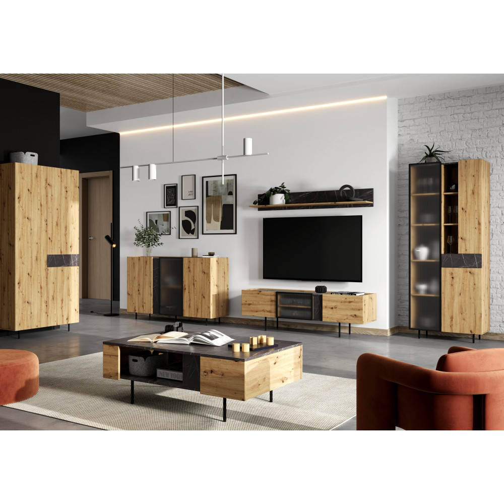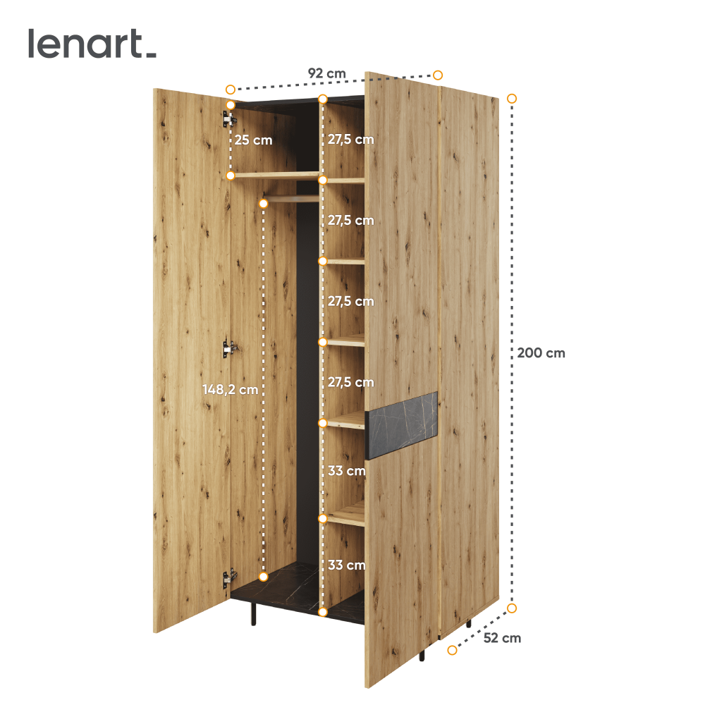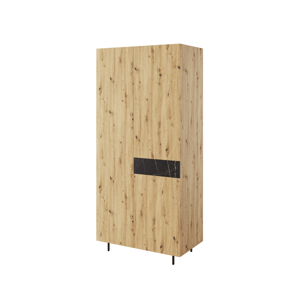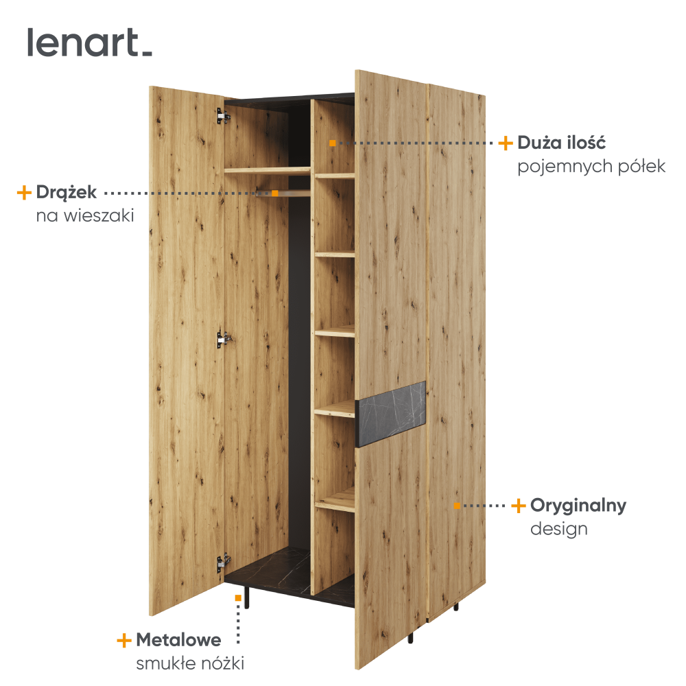 Szafa do pokoju dziennego łączy nowoczesny design z funkcjonalnością. Wykonana w eleganckim połączeniu marmurowej czerni i dekoru drewna - dębu artisan. Nadaje wnętrzu modny, a jednocześnie przytulny charakter. Mebel opiera się na smukłych metalowych nóżkach, co dodaje mu lekkości. Szafa dwudrzwiowa jest wyposażona w praktyczny układ półek oraz drążek na wieszaki. Dla wygody użytkowania zastosowano system SOFT CLOSE, który zapewnia komfort podczas codziennego korzystania.