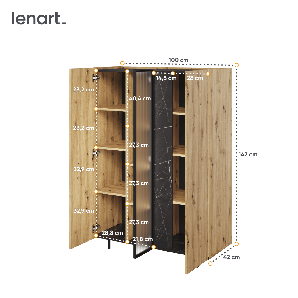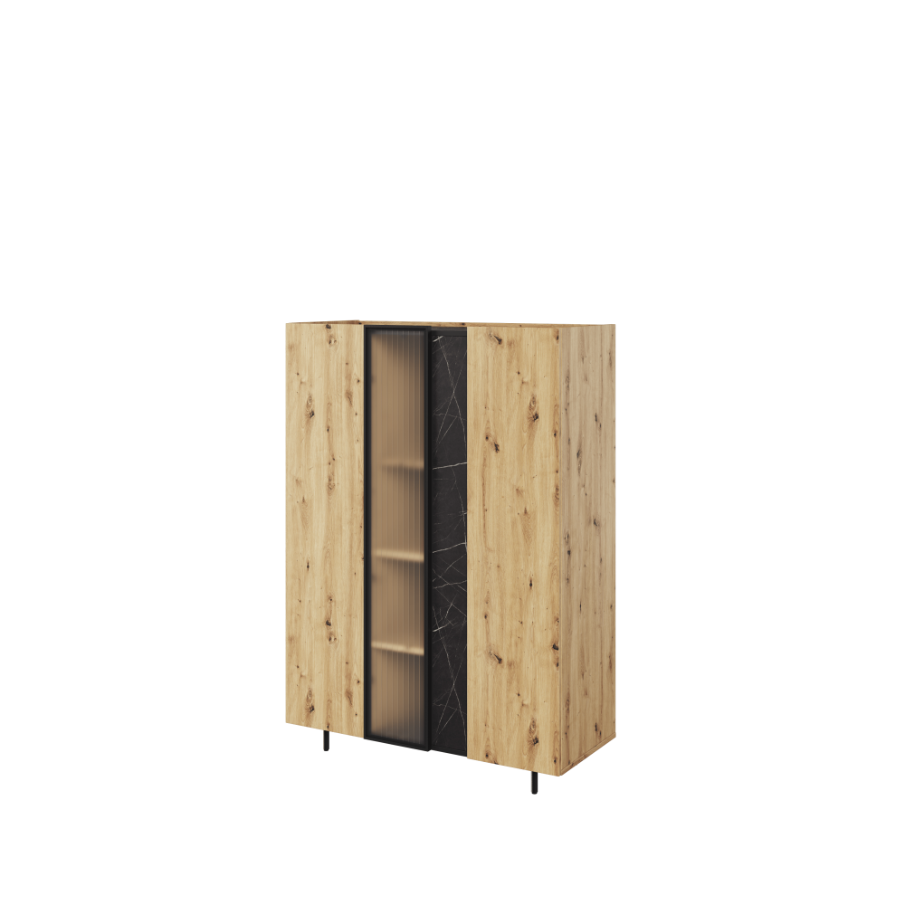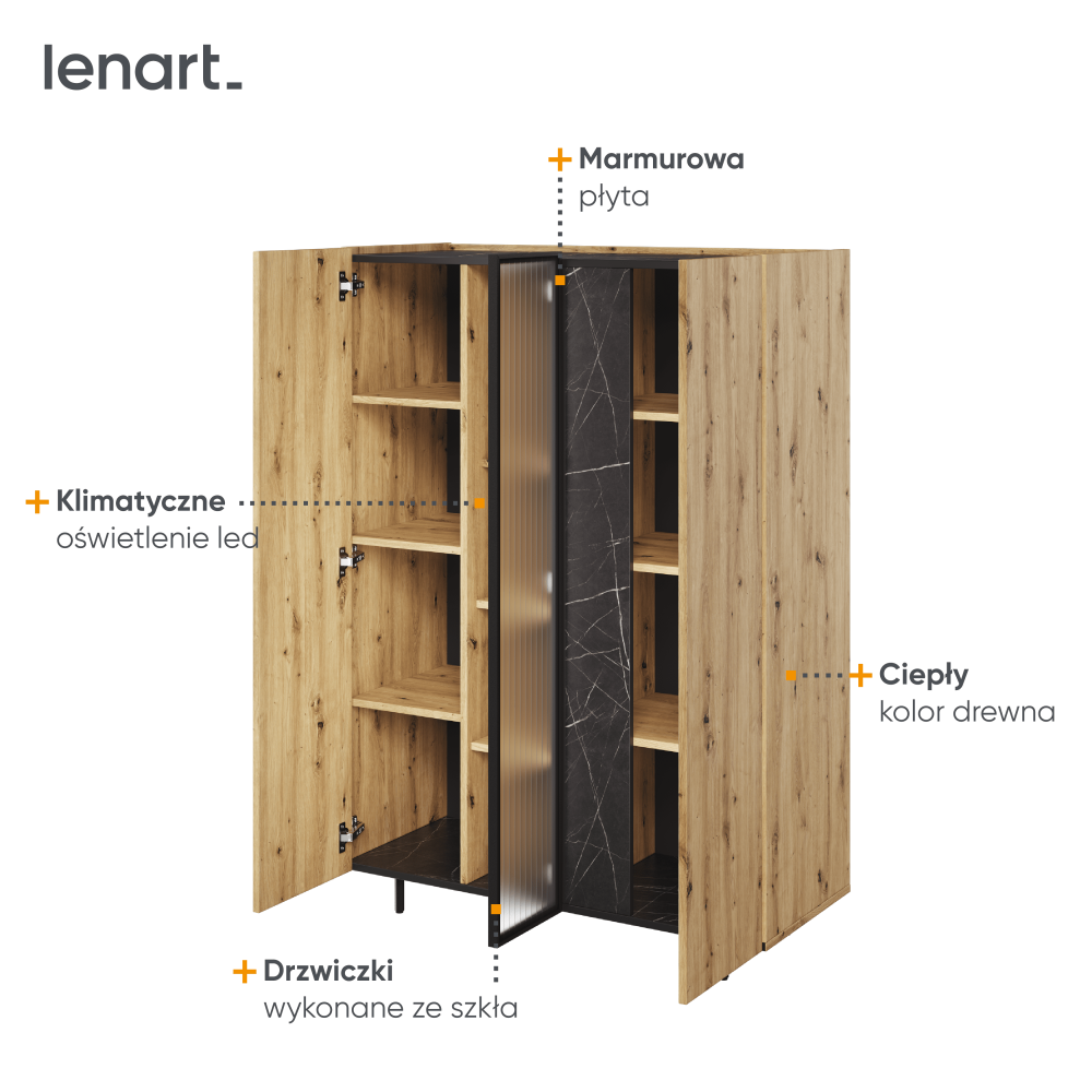 Szafka w nowoczesnym stylu łączy dekor w ciepłym odcieniu drewna, czarną płytę o marmurowym wzorze oraz ornamentowe szkło, tworząc harmonijną aranżację pełną elegancji. Mebel osadzony na smukłych nóżkach prezentuje się lekko i stylowo. W komplecie znajduje się również oświetlenie, które nadaje wnętrzu nastrojowy klimat, subtelnie podkreślając dekoracje umieszczone za przeszklonymi drzwiczkami, tworząc wyjątkowy efekt.