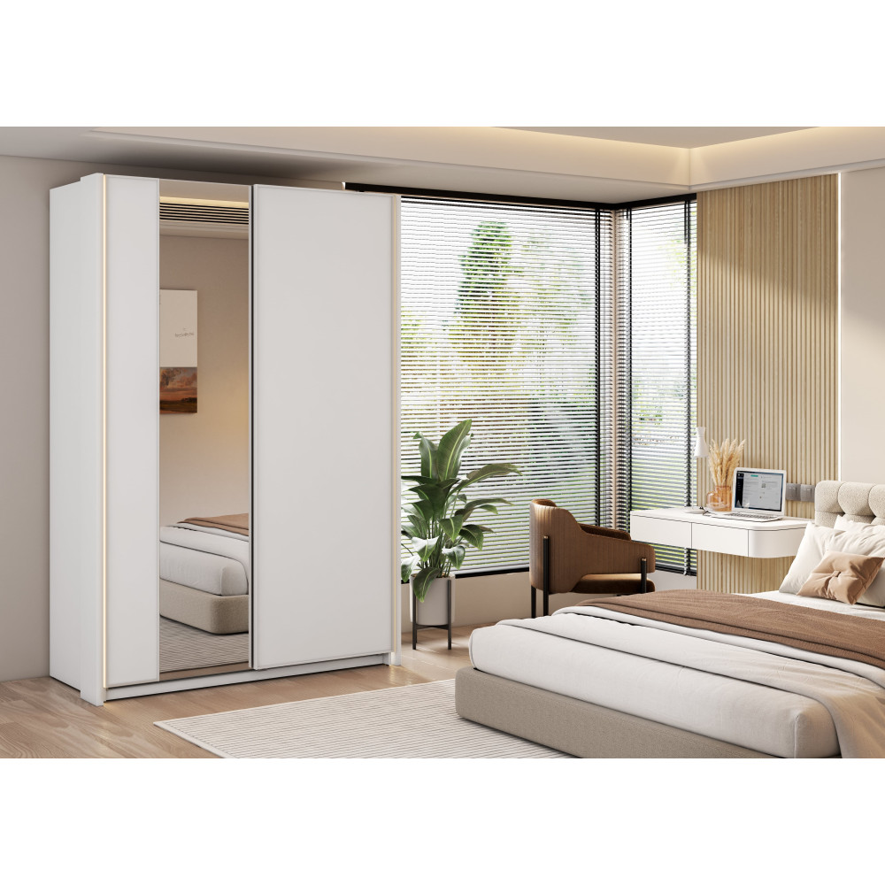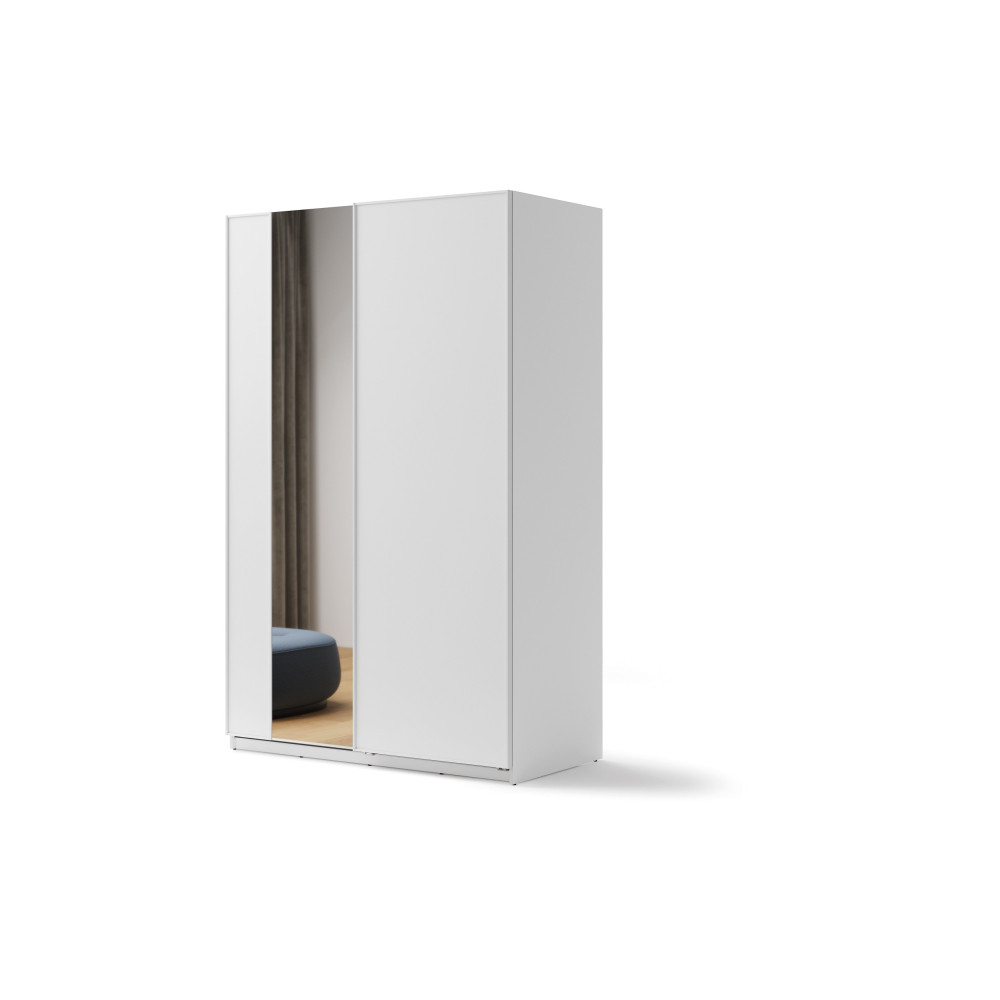 Nowoczesna, biała szafa przesuwna o szerokości 150 cm wprowadza elegancki charakter do przestrzeni. Lustro na froncie optycznie powiększa pomieszczenie i umożliwia łatwe przetestowanie każdej stylizacji. Szafa zaprojektowana z myślą o funkcjonalności zawiera 7 półek, z czego 2 wyposażone są w drążki na ubrania, co ułatwia wygodne przechowywanie różnorodnych elementów garderoby.