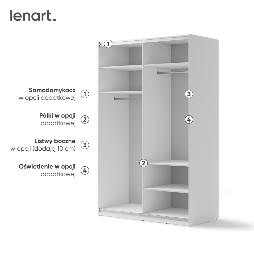 Dodatkowo istnieje możliwość wzbogacenia szafy o kontenerek, idealny do przechowywania bielizny, samodomykacz do drzwi przesuwnych, zwiększający komfort użytkowania, dodatkowe półki oraz listwy z oświetleniem LED w kolorze białym, które pozwalają na dostosowanie wnętrza szafy do indywidualnych potrzeb. Dzięki tym dodatkom szafa staje się nie tylko praktycznym, ale i stylowym elementem wyposażenia.