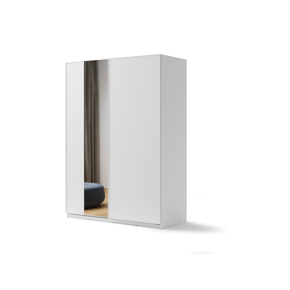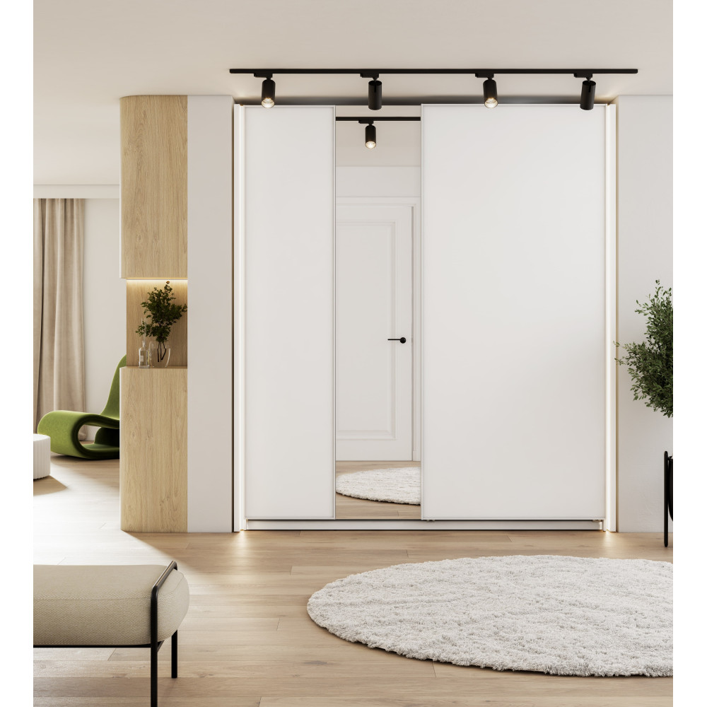 Nowoczesna, biała szafa przesuwna o szerokości 170 cm wprowadza elegancki charakter do przestrzeni. Lustro na froncie optycznie powiększa pomieszczenie i umożliwia łatwe przetestowanie każdej stylizacji. Szafa zaprojektowana z myślą o funkcjonalności zawiera 7 półek, z czego 2 wyposażone są w drążki na ubrania, co ułatwia wygodne przechowywanie różnorodnych elementów garderoby.