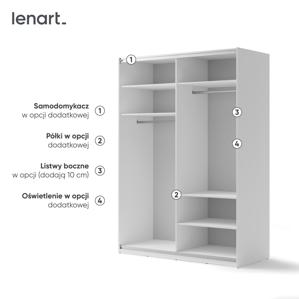Dodatkowo istnieje możliwość wzbogacenia szafy o kontenerek, idealny do przechowywania bielizny, samodomykacz do drzwi przesuwnych, zwiększający komfort użytkowania, dodatkowe półki oraz listwy z oświetleniem LED w kolorze białym, które pozwalają na dostosowanie wnętrza szafy do indywidualnych potrzeb. Dzięki tym dodatkom szafa staje się nie tylko praktycznym, ale i stylowym elementem wyposażenia.