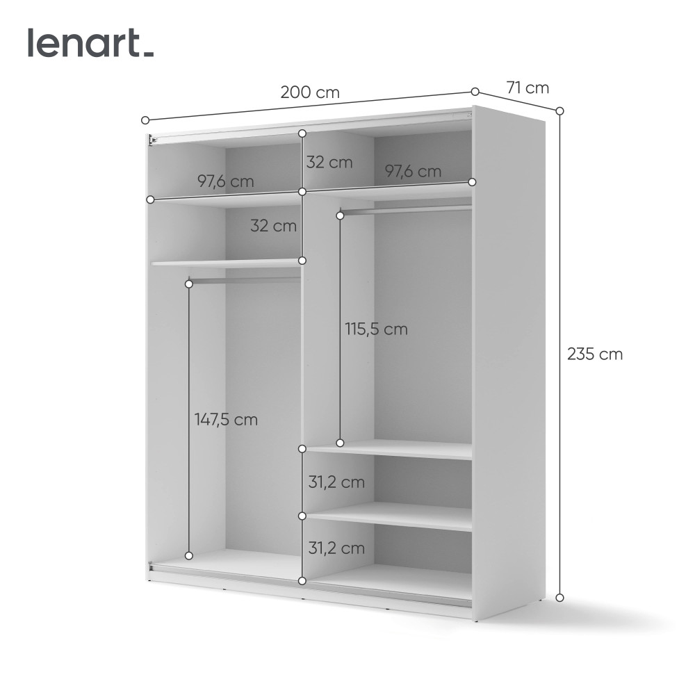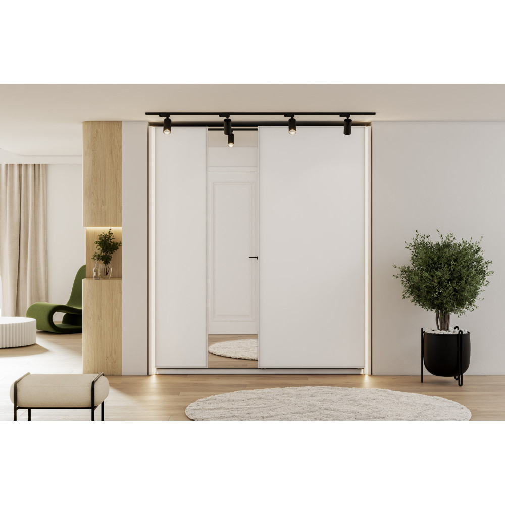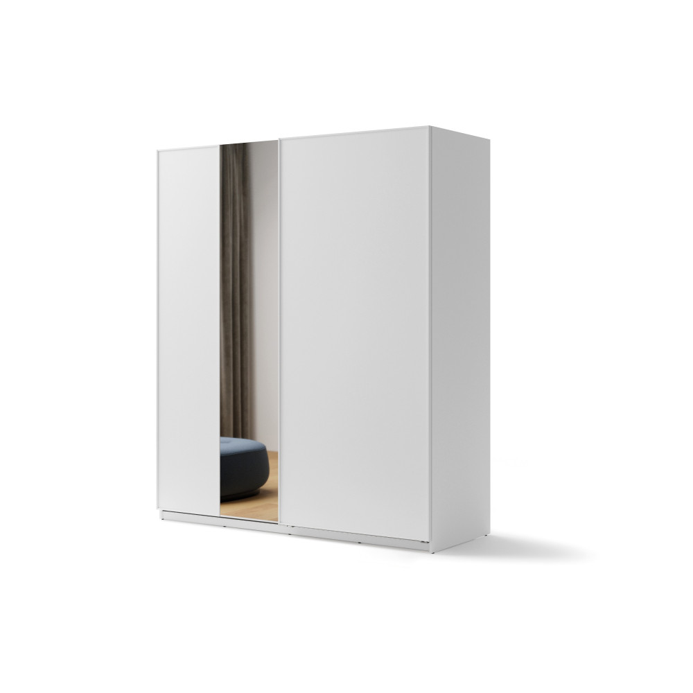 Nowoczesna, biała szafa przesuwna o szerokości 200 cm wprowadza elegancki charakter do przestrzeni. Lustro na froncie optycznie powiększa pomieszczenie i umożliwia łatwe przetestowanie każdej stylizacji. Szafa zaprojektowana z myślą o funkcjonalności zawiera 7 półek, z czego 2 wyposażone są w drążki na ubrania, co ułatwia wygodne przechowywanie różnorodnych elementów garderoby.
