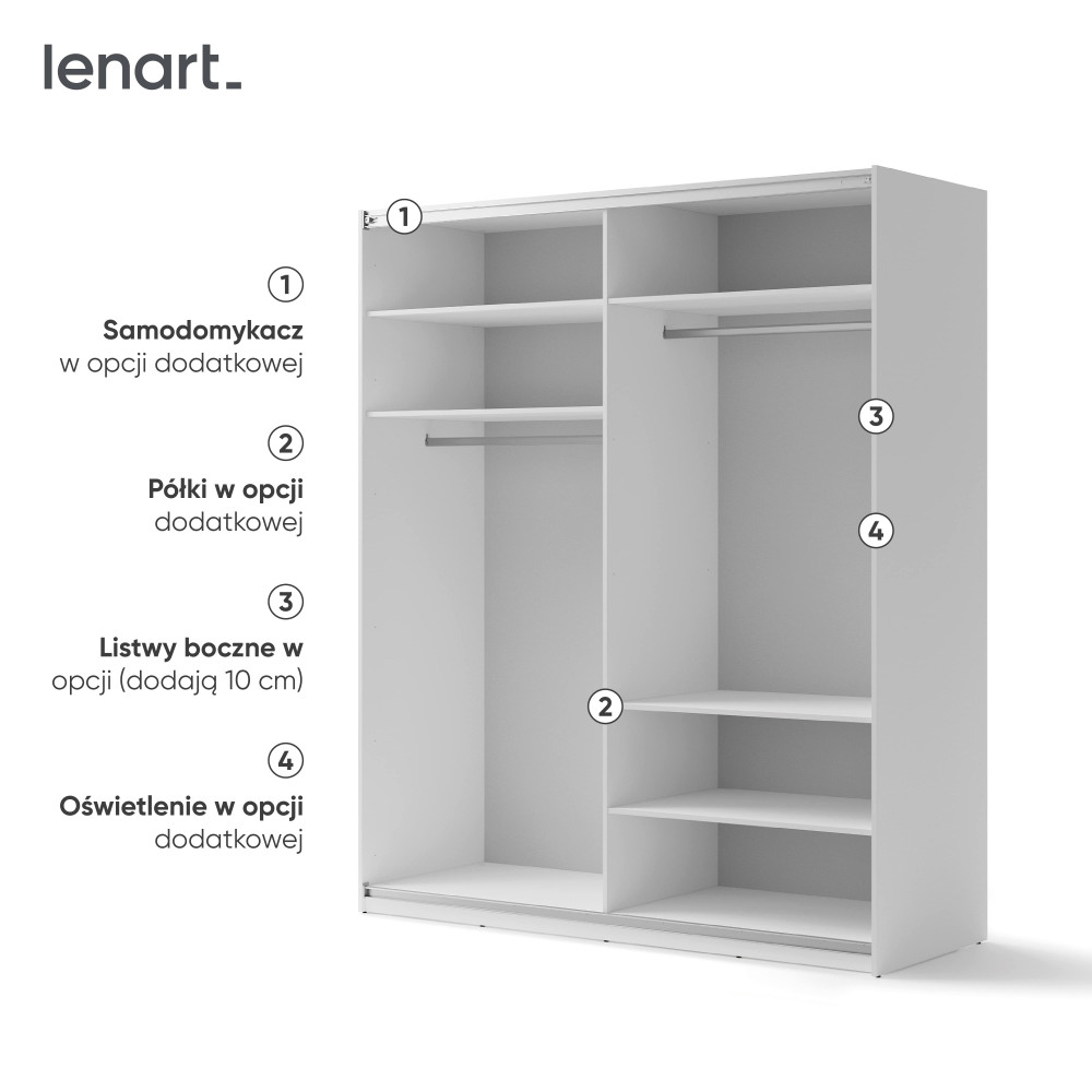 Dodatkowo istnieje możliwość wzbogacenia szafy o kontenerek, idealny do przechowywania bielizny, samodomykacz do drzwi przesuwnych, zwiększający komfort użytkowania, dodatkowe półki oraz listwy z oświetleniem LED w kolorze białym, które pozwalają na dostosowanie wnętrza szafy do indywidualnych potrzeb. Dzięki tym dodatkom szafa staje się nie tylko praktycznym, ale i stylowym elementem wyposażenia.