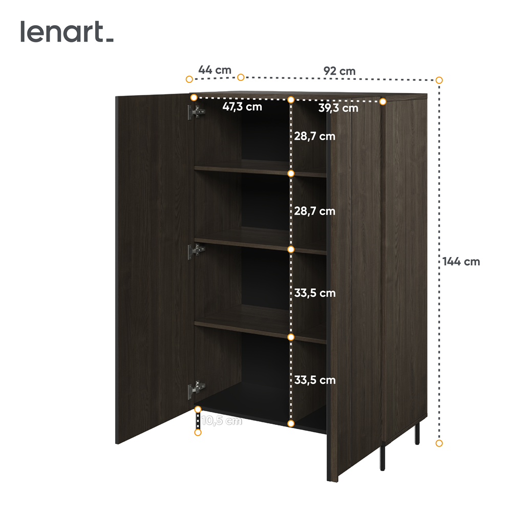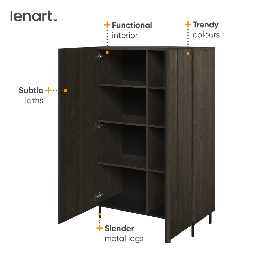 Nowoczesna szafka 2-drzwiowa to idealne połączenie elegancji i funkcjonalności, które wzbogaci każde wnętrze. Oryginalne zestawienie kolorów – subtelny jesion portland w duecie z głęboką czernią – nadaje meblowi wyjątkowy charakter, który przyciągnie wzrok i podkreśli styl Twojego salonu.
