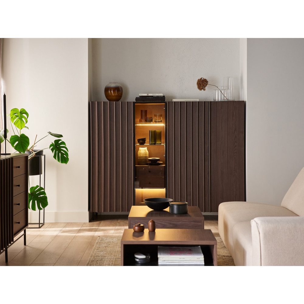 Z subtelnymi lamelami, które nadają lekkości i finezji, szafka nie tylko prezentuje się zjawiskowo, ale również oferuje praktyczne rozwiązania do przechowywania.