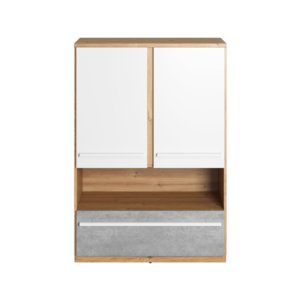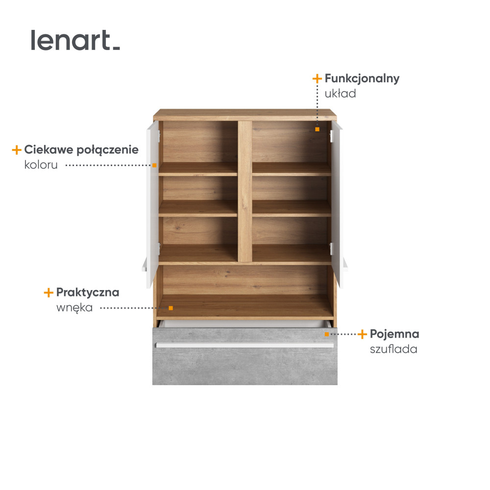 Dwudrzwiowa szafka w nowoczesnym stylu, łącząca kolory dąb nash, biel i szarego betonu, doskonale sprawdzi się w pokojach zarówno dziewcząt, jak i chłopców. Jej funkcjonalny układ obejmuje pojemną, łatwo dostępną szufladę na dole, wnękę na drobne przedmioty oraz sześć półek ukrytych za drzwiami, co zapewnia dużo miejsca do przechowywania. Dzięki starannie dobranym detalom i praktycznej konstrukcji, szafka nie tylko ułatwia organizację, ale też nadaje wnętrzu stylowy i nowoczesny wygląd.