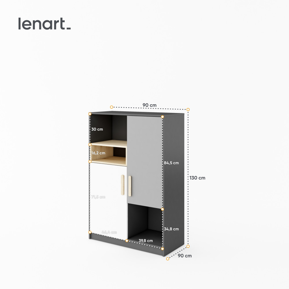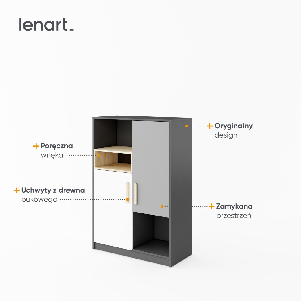 Oryginalna, asymetryczna szafka w nowoczesnym połączeniu kolorów: buk Ibsen, grafit i jasna szarość, to idealne rozwiązanie dla osób ceniących styl i funkcjonalność. Wyposażona w dwoje drzwi, kryje przestronne wnętrze do przechowywania, a dodatkowo posiada trzy otwarte półki, które świetnie nadają się do wyeksponowania dekoracji, książek lub innych przedmiotów. Drewniane uchwyty z bukowego drewna podkreślają naturalny charakter mebla, tworząc harmonijną całość z jego nowoczesnym designem.