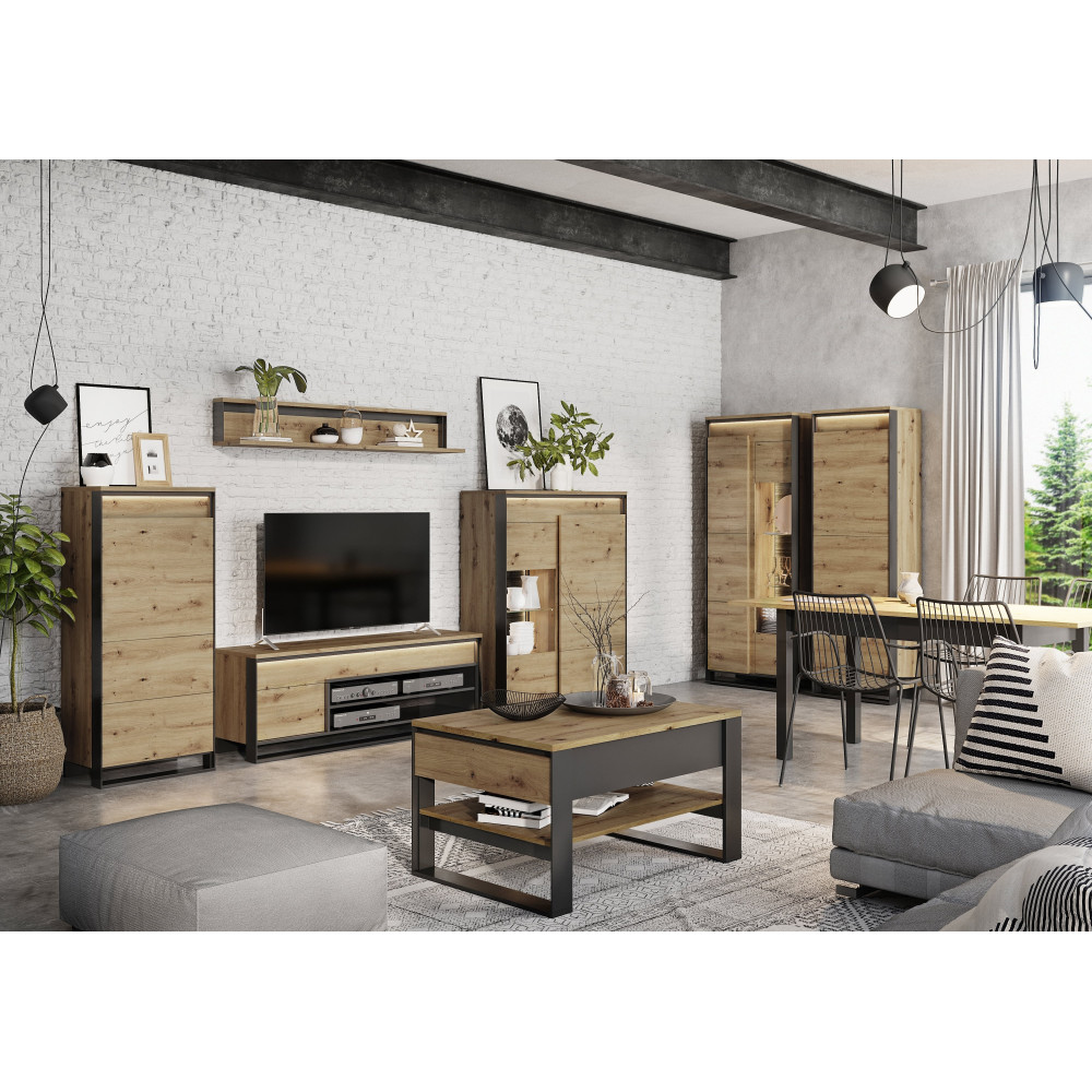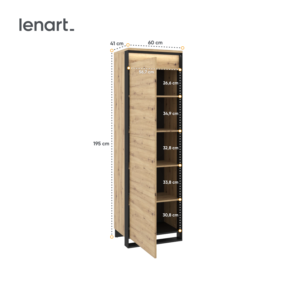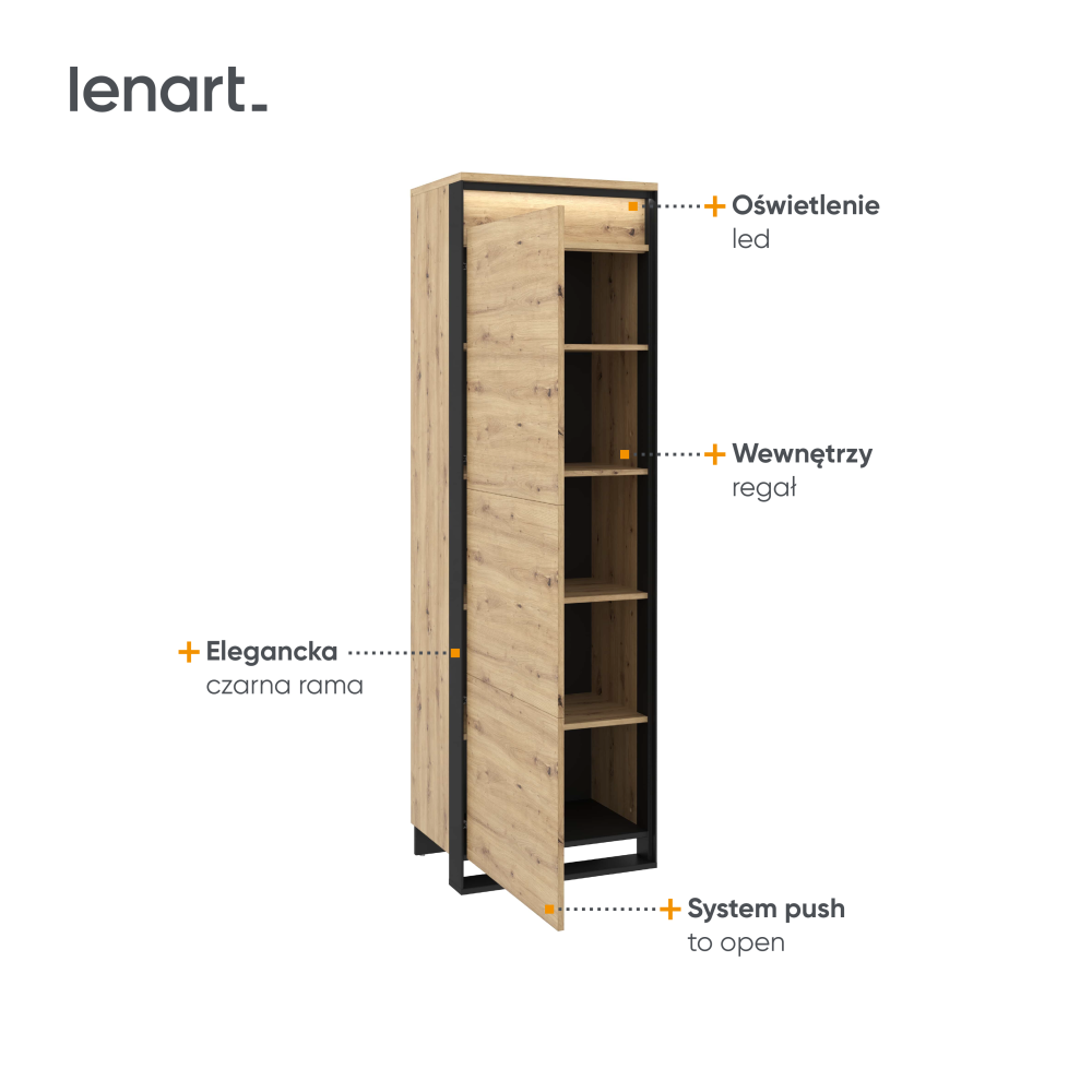 Jednodrzwiowa szafa to doskonały wybór dla osób, które cenią nowoczesny design i funkcjonalność. Wewnątrz znajduje się regał z półkami, zapewniający świetną organizację garderoby. Przemyślany podział wnętrza ułatwia wygodne rozmieszczenie ubrań, a mechanizm PUSH TO OPEN umożliwia komfortowe użytkowanie bez uchwytów. Połączenie dekoru w kolorze dębu artisan i czerni nadaje szafie elegancki, nowoczesny charakter, idealnie łącząc ciepło drewna z industrialnym stylem. To praktyczny i stylowy element, który wzbogaci każdą sypialnię.
