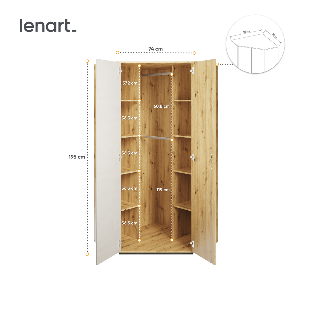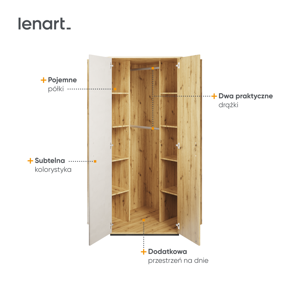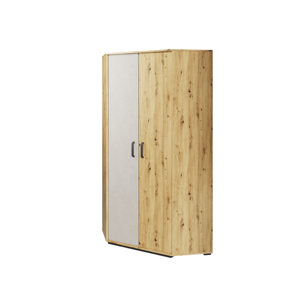 Narożna szafa to doskonałe rozwiązanie do optymalizacji przestrzeni w rogu pokoju. Jej nowoczesny charakter podkreślają fronty drzwi, oryginalnie wsunięte pod korpus, oraz eleganckie metalowe uchwyty i niskie podpory. Wewnątrz znajdują się dwa praktyczne drążki oraz dwa regały z półkami, które umożliwiają efektywne przechowywanie ubrań i akcesoriów. Dodatkowa przestrzeń na dnie szafy idealnie nadaje się na przechowywanie pudełek z obuwiem lub sprzętu sportowego. Uniwersalne połączenie subtelnej szarości z ciepłym, drewnopodobnym dekorze dębu artisan sprawia, że mebel wpasuje się zarówno w wnętrza dziewcząt, jak i chłopców. Szafa została wykonana z wytrzymałej płyty laminowanej, wykończonej trwałym obrzeżem ABS, co gwarantuje długotrwałe użytkowanie.