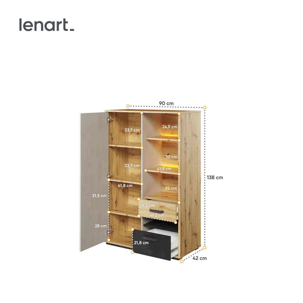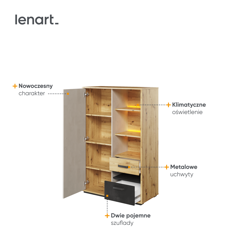 Szafka charakteryzuje się nowoczesnym designem i funkcjonalnością. Za drzwiami kryją się cztery praktyczne półki, idealne do przechowywania różnych przedmiotów, a dwie łatwo dostępne szuflady ułatwiają organizację drobiazgów. Otwarte półki doskonale sprawdzą się jako miejsce na książki, pomoce naukowe czy dekoracje. Nowoczesny wygląd szafki podkreślają eleganckie, metalowe uchwyty oraz niskie podpory. W zestawie znajduje się oświetlenie LED, które nie tylko dodaje stylu, ale również ułatwia korzystanie z wnętrza mebla.