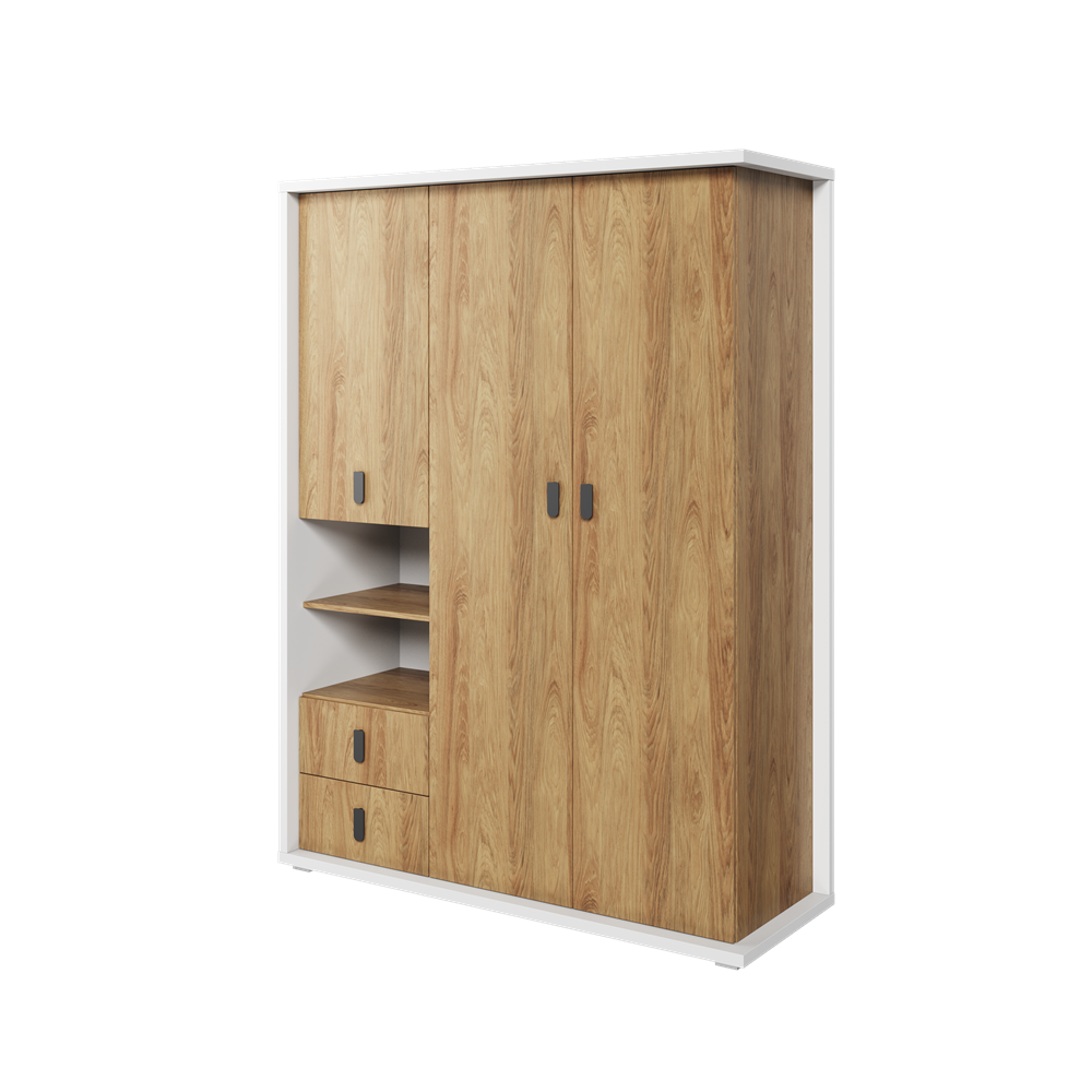 Wyposażona w długi drążek, oferuje obszerną przestrzeń do przechowywania ubrań, a także w dwie pojemne szuflady idealne na drobiazgi. Wnęki oraz półki ukryte za drzwiami zapewniają dodatkowe miejsce na różnorodne akcesoria, dbając o porządek w każdej sypialni. Cofnięte fronty harmonijnie współgrają z linią korpusu, nadając meblowi subtelności i charakteru.