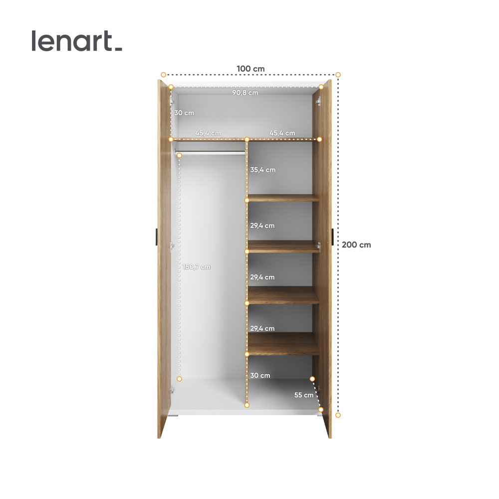 Elegancka szafa, która harmonijnie łączy funkcjonalność z nowoczesnym stylem. Przemyślany układ wnętrza został podzielony na pół, tworząc idealne miejsce na wewnętrzny regał z półkami oraz praktyczny drążek na odzież, co sprawia, że organizacja przestrzeni staje się łatwiejsza. Dodatkowe miejsce do przechowywania znajduje się na wysokiej półce nad drążkiem oraz na dnie szafy, co pozwala na maksymalne wykorzystanie dostępnej przestrzeni.