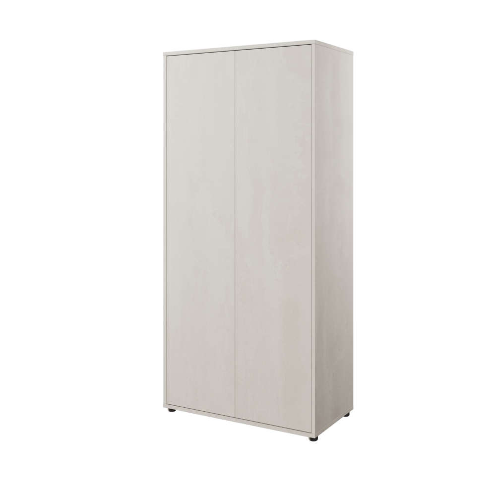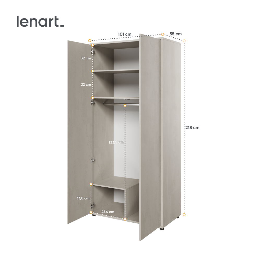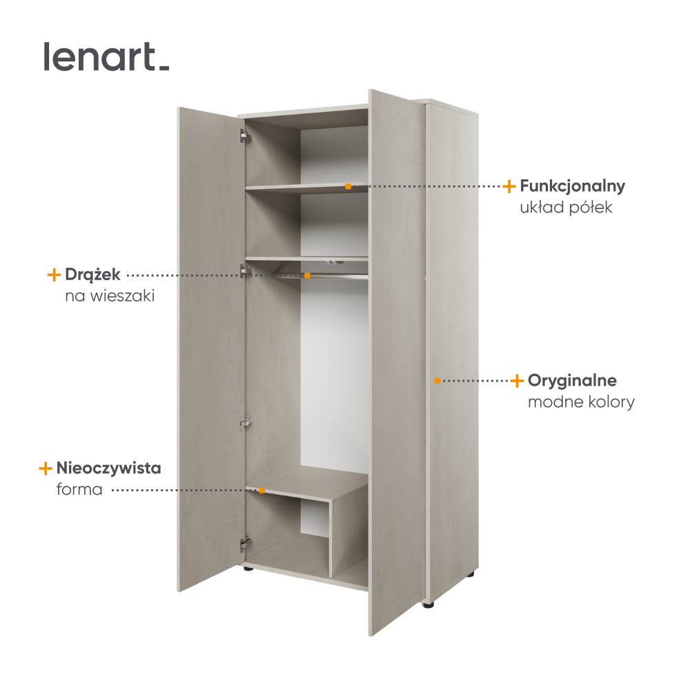 Szafa dla nastolatków to nowoczesny, przestronny mebel w odcieniach szarości, doskonale zaprojektowany, by sprostać potrzebom młodzieży. Wyróżnia się nieoczywistym wnętrzem, które pozwala na maksymalne wykorzystanie przestrzeni. Szafa wyposażona jest w dwie górne półki, idealne do przechowywania rzadziej używanych przedmiotów, oraz szeroki drążek na wieszaki, umożliwiający wygodne organizowanie odzieży. Całość tworzy harmonijne połączenie stylu z funkcjonalnością, wprowadzając do pokoju porządek i nowoczesny design, który doskonale wpisuje się w przestrzeń młodzieżowego pokoju.