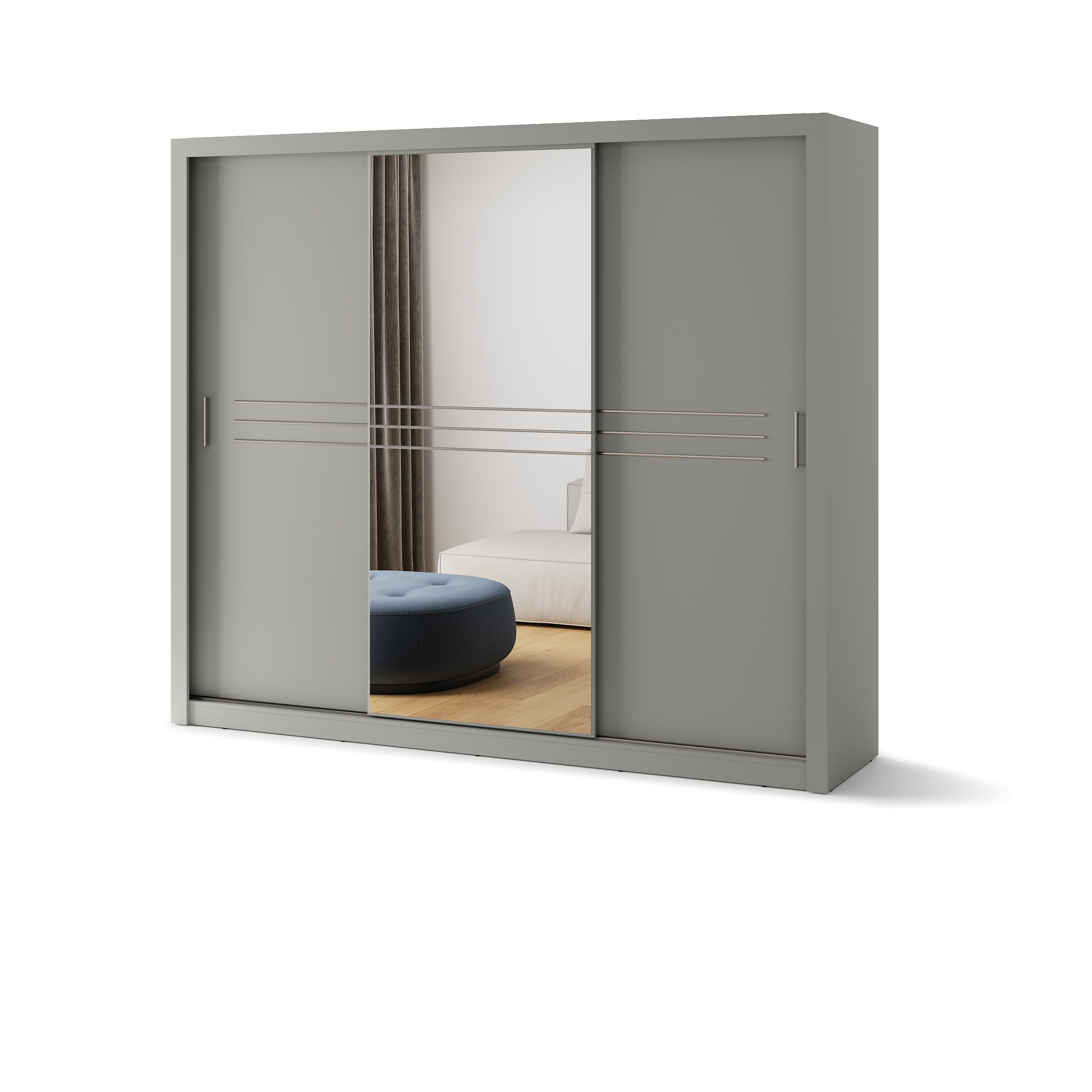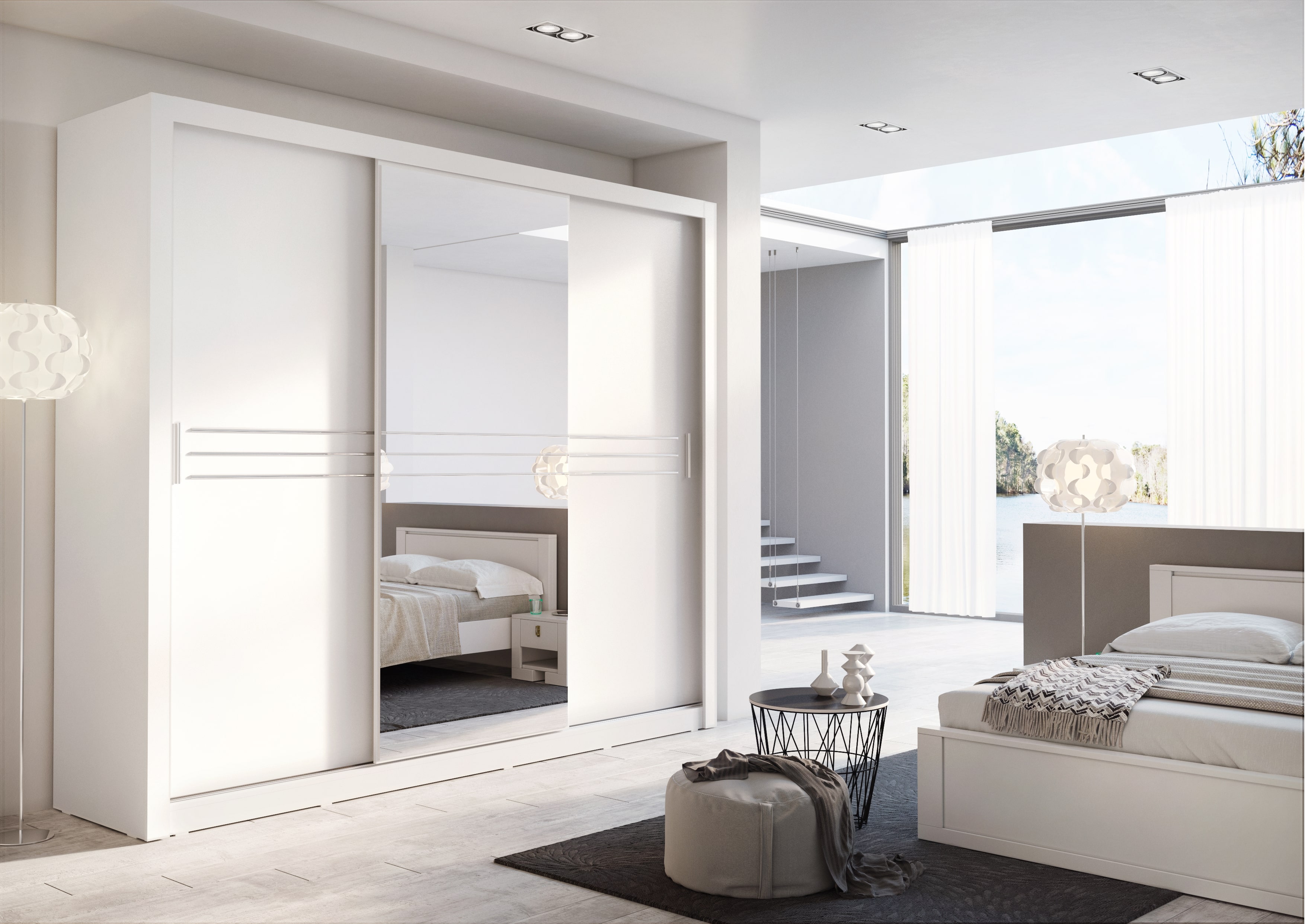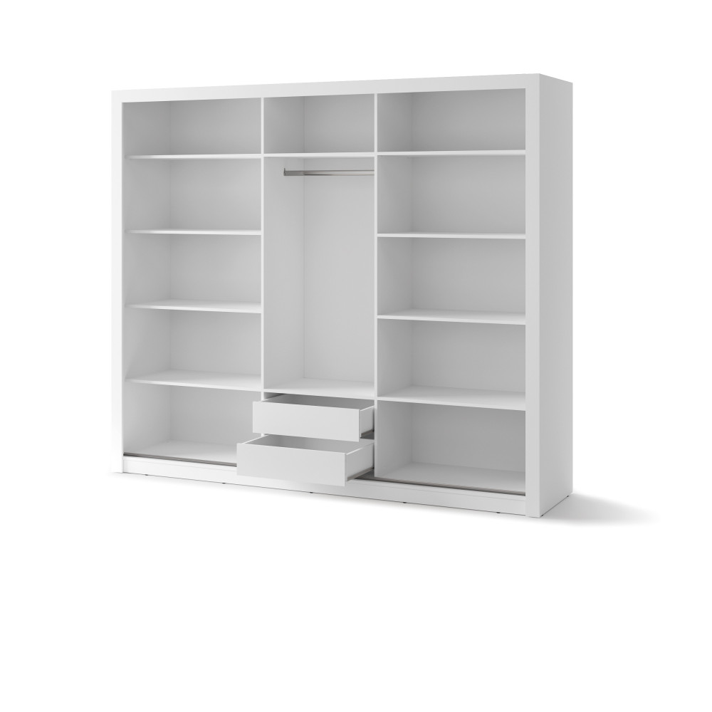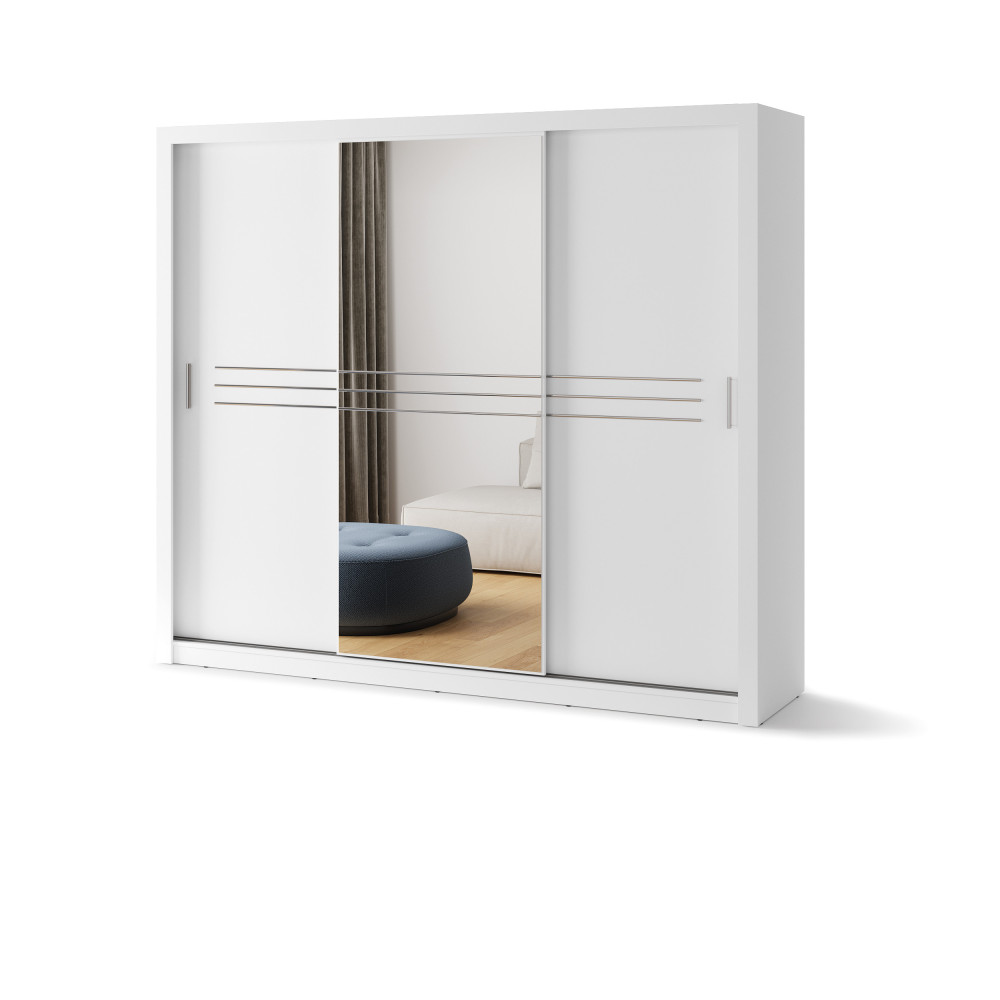 Duża i pojemna szafa z dwojgiem drzwi przesuwnych, dostępna w kolorze białym oraz szarym. Na froncie jednych drzwi umieszczono lustro, co dodaje funkcjonalności i optycznie powiększa przestrzeń. Wnętrze szafy ma symetryczny układ, co ułatwia organizację przechowywanych rzeczy.