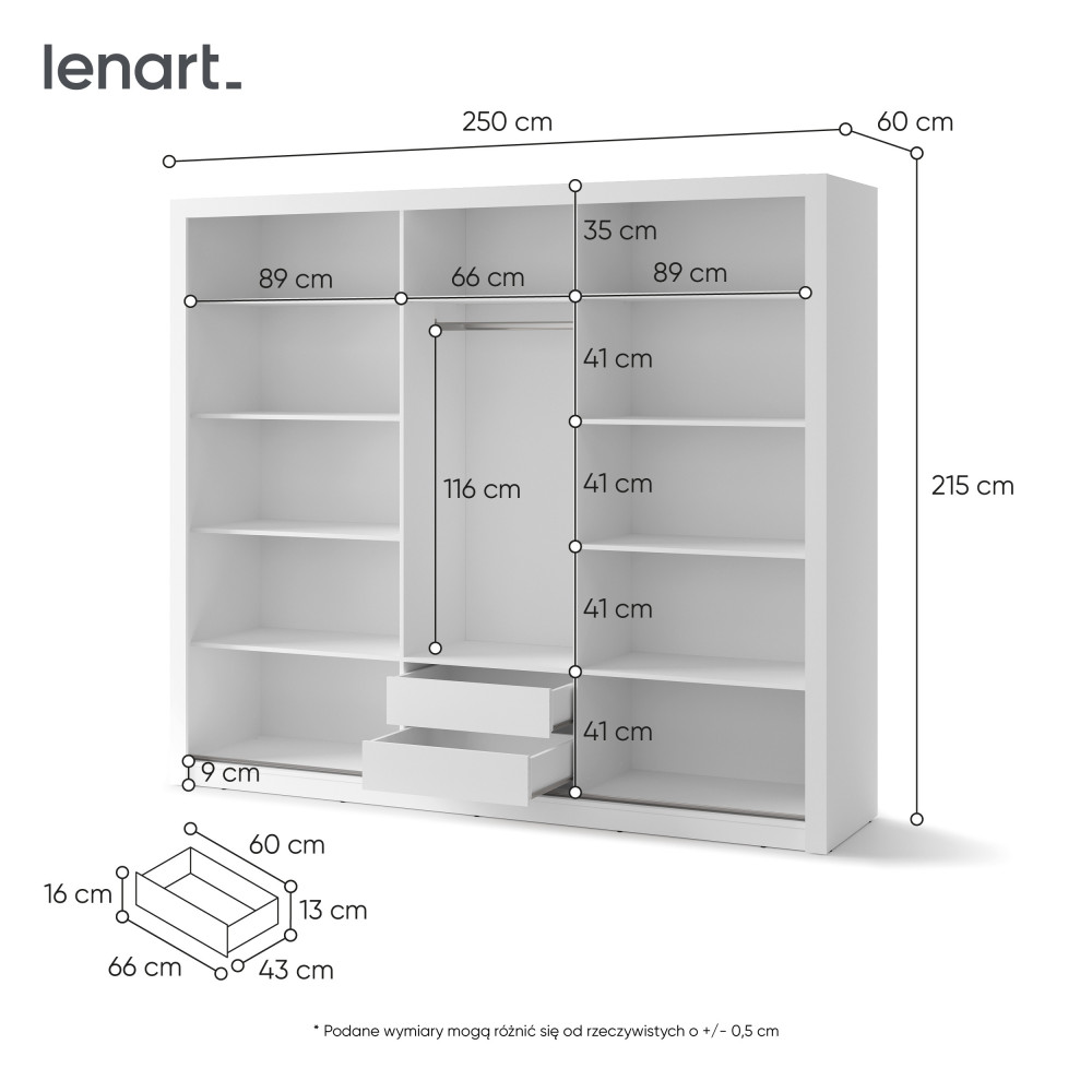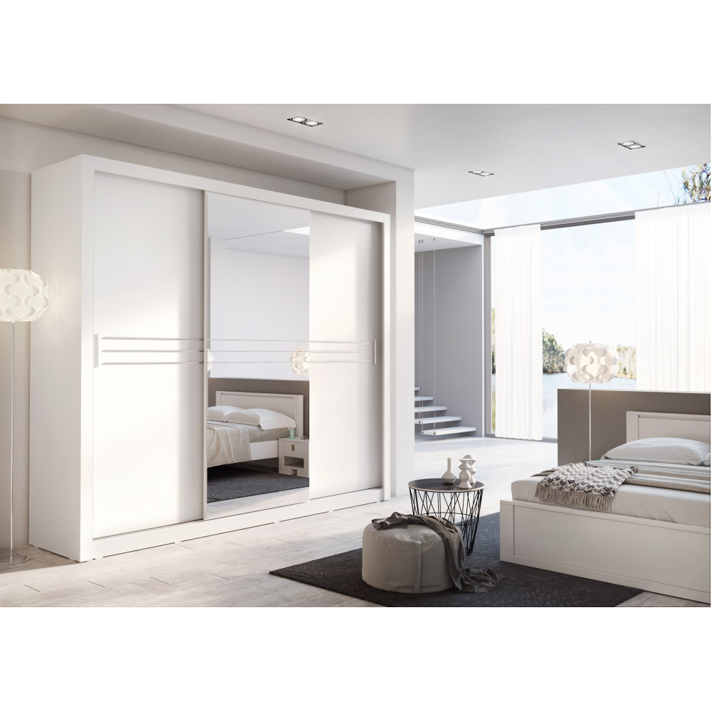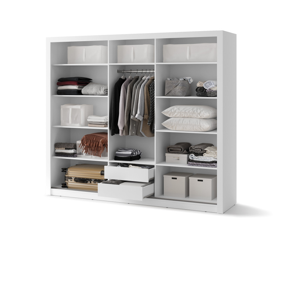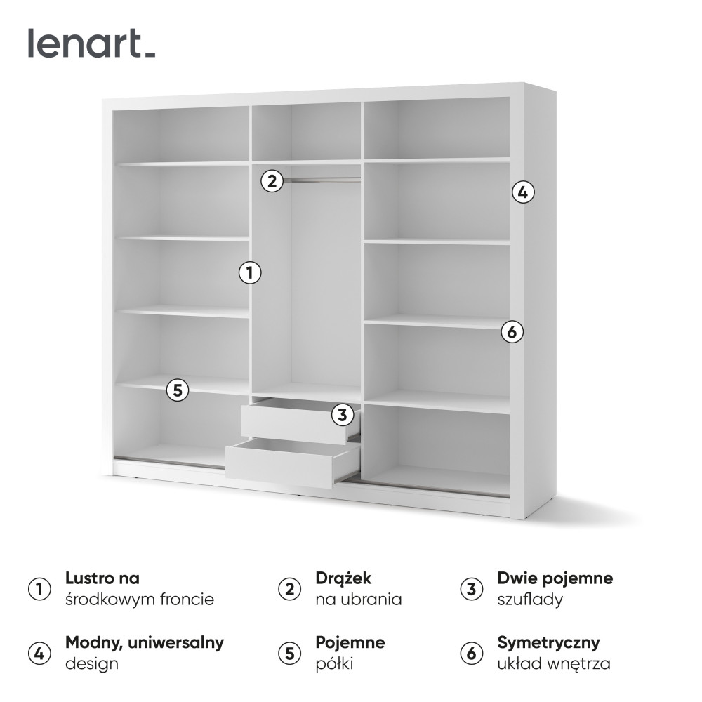 Duża i pojemna szafa z dwojgiem drzwi przesuwnych, dostępna w kolorze białym oraz szarym. Na froncie jednych drzwi umieszczono lustro, co dodaje funkcjonalności i optycznie powiększa przestrzeń. Wnętrze szafy ma symetryczny układ, co ułatwia organizację przechowywanych rzeczy.