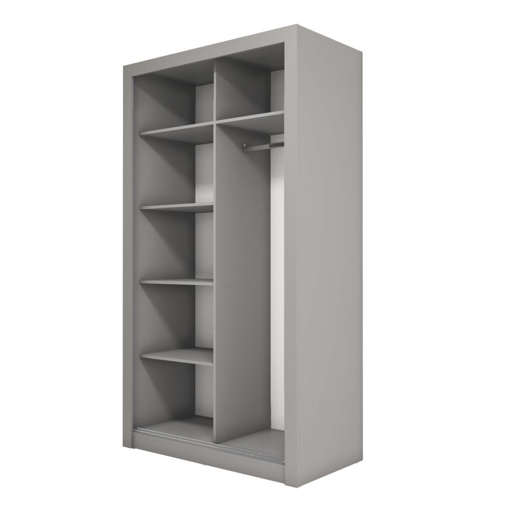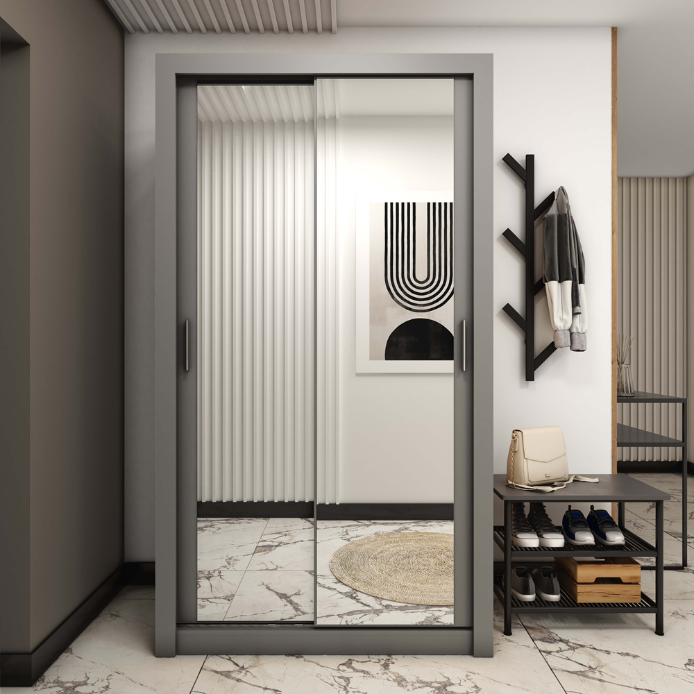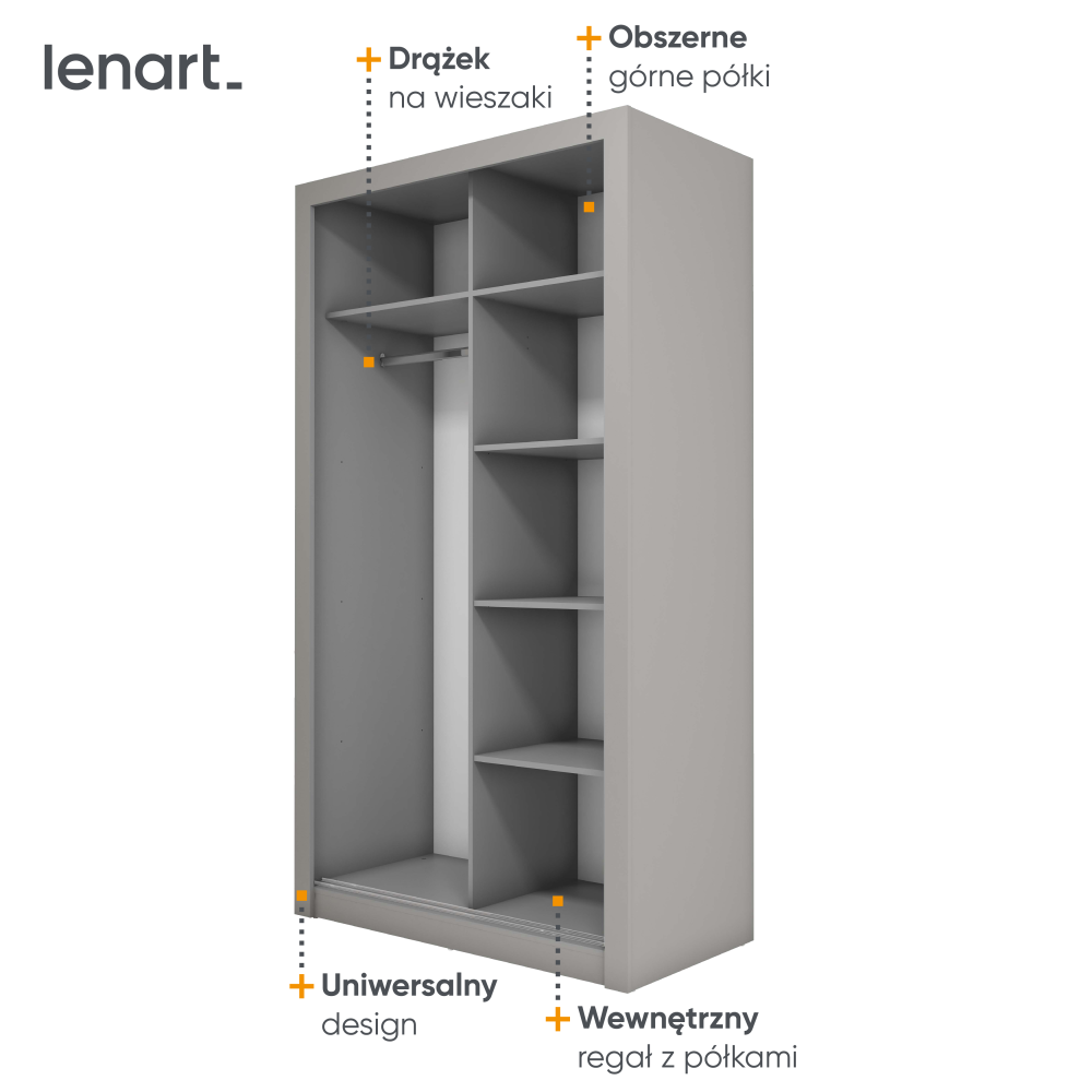 Niewielka, funkcjonalna szafa z dwojgiem drzwi przesuwnych, które świetnie oszczędzają przestrzeń – idealna do sypialni, garderoby lub przedpokoju. Dostępna w trzech eleganckich kolorach: białym, szarym oraz dąb shetland, dzięki czemu można ją dopasować do różnych aranżacji wnętrz. Wewnątrz szafy znajduje się praktyczny drążek na wieszaki, obszerny regał z półkami oraz dodatkowe, przestronne górne półki, które pozwalają na uporządkowane przechowywanie ubrań i akcesoriów. Uniwersalny design sprawia, że szafa wpasuje się zarówno w nowoczesne, jak i klasyczne wnętrza. Istnieje możliwość skompletowania jej z energooszczędnym dwupunktowym oświetleniem LED, które podkreśli walory estetyczne i ułatwi korzystanie z szafy o każdej porze dnia.