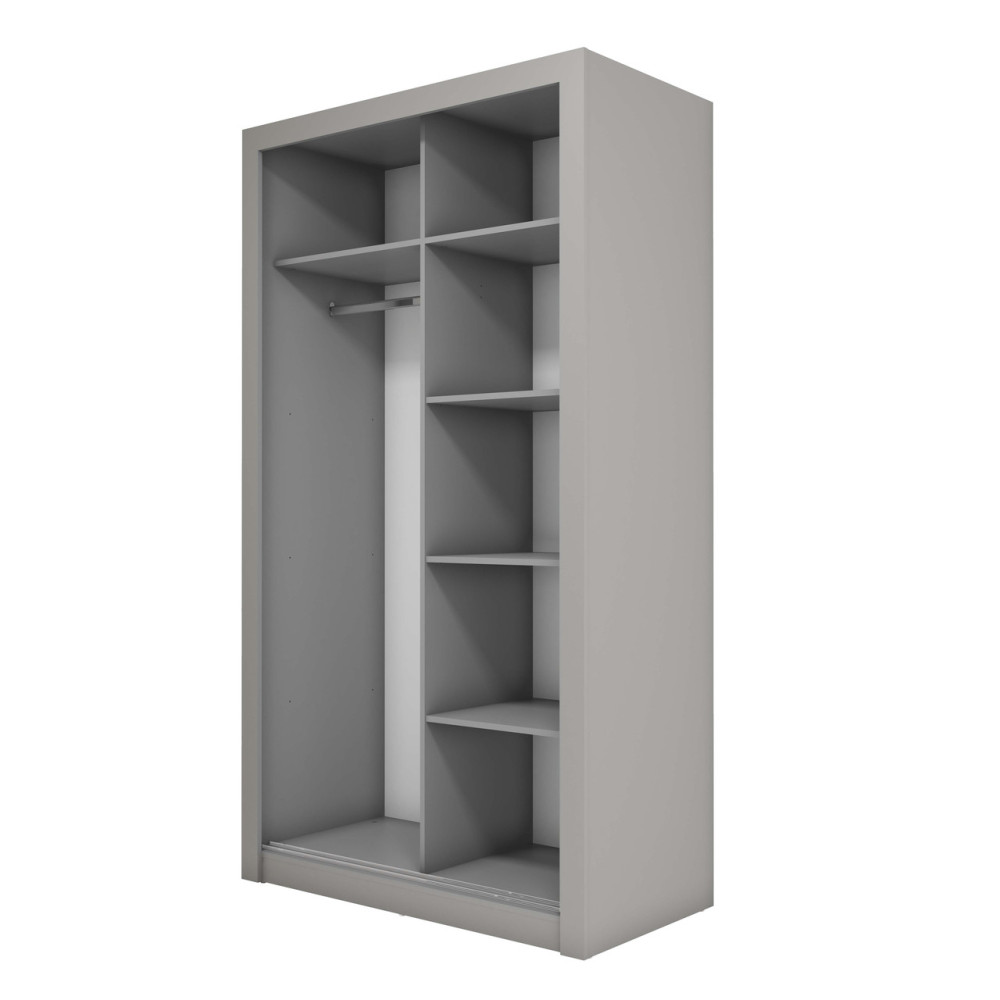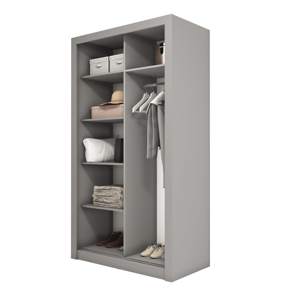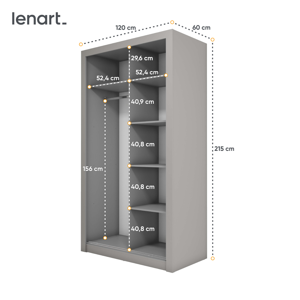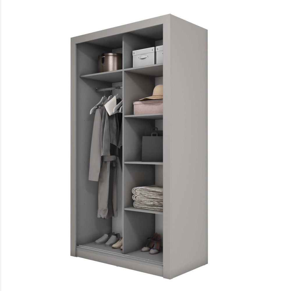 Niewielka, funkcjonalna szafa z dwojgiem drzwi przesuwnych, które świetnie oszczędzają przestrzeń – idealna do sypialni, garderoby lub przedpokoju. Dostępna w trzech eleganckich kolorach: białym, szarym oraz dąb shetland, dzięki czemu można ją dopasować do różnych aranżacji wnętrz. Wewnątrz szafy znajduje się praktyczny drążek na wieszaki, obszerny regał z półkami oraz dodatkowe, przestronne górne półki, które pozwalają na uporządkowane przechowywanie ubrań i akcesoriów. Uniwersalny design sprawia, że szafa wpasuje się zarówno w nowoczesne, jak i klasyczne wnętrza. Istnieje możliwość skompletowania jej z energooszczędnym dwupunktowym oświetleniem LED, które podkreśli walory estetyczne i ułatwi korzystanie z szafy o każdej porze dnia.