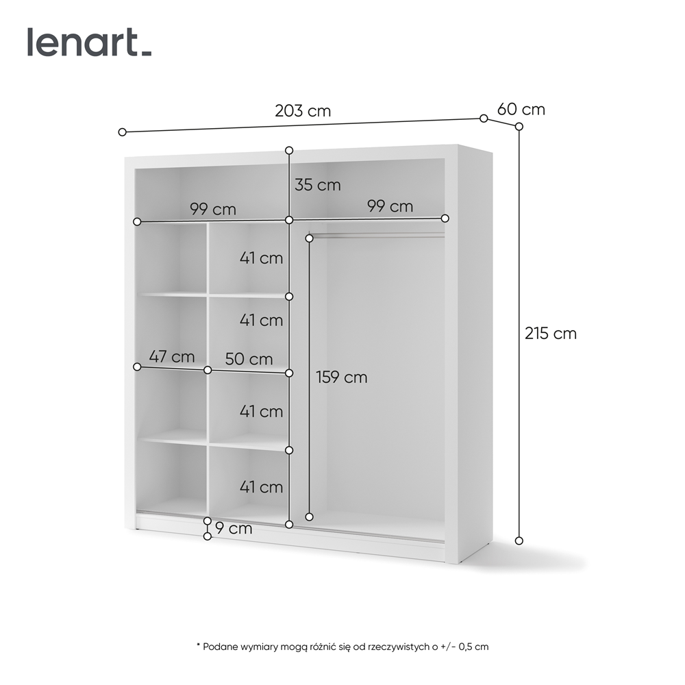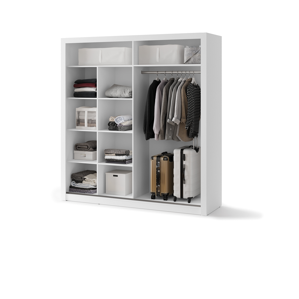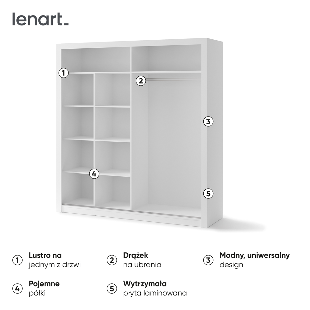 Nowoczesna i funkcjonalna szafa o modnym, uniwersalnym designie, idealna do każdego wnętrza – od sypialni po przedpokój. Wykonana z wytrzymałej płyty laminowanej, która jest odporna na zarysowania i łatwa w czyszczeniu, zapewnia trwałość na lata. Drzwi przesuwne oszczędzają przestrzeń, co czyni ją doskonałym wyborem nawet do mniejszych pomieszczeń. Lustro na jednym ze skrzydeł nie tylko pełni funkcję praktyczną, ale także optycznie powiększa wnętrze. Przemyślane wnętrze szafy z drążkiem na ubrania oraz pojemnymi półkami ułatwia organizację i pozwala na wygodne przechowywanie różnych przedmiotów, od ubrań po akcesoria. Istnieje możliwość skompletowania szafy z kontenerkiem.