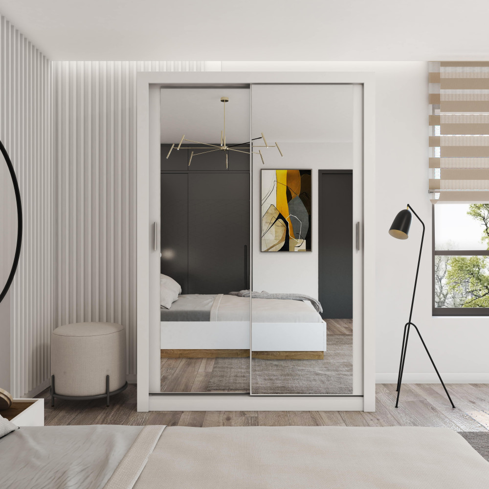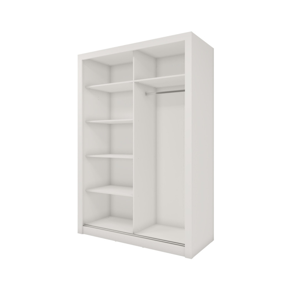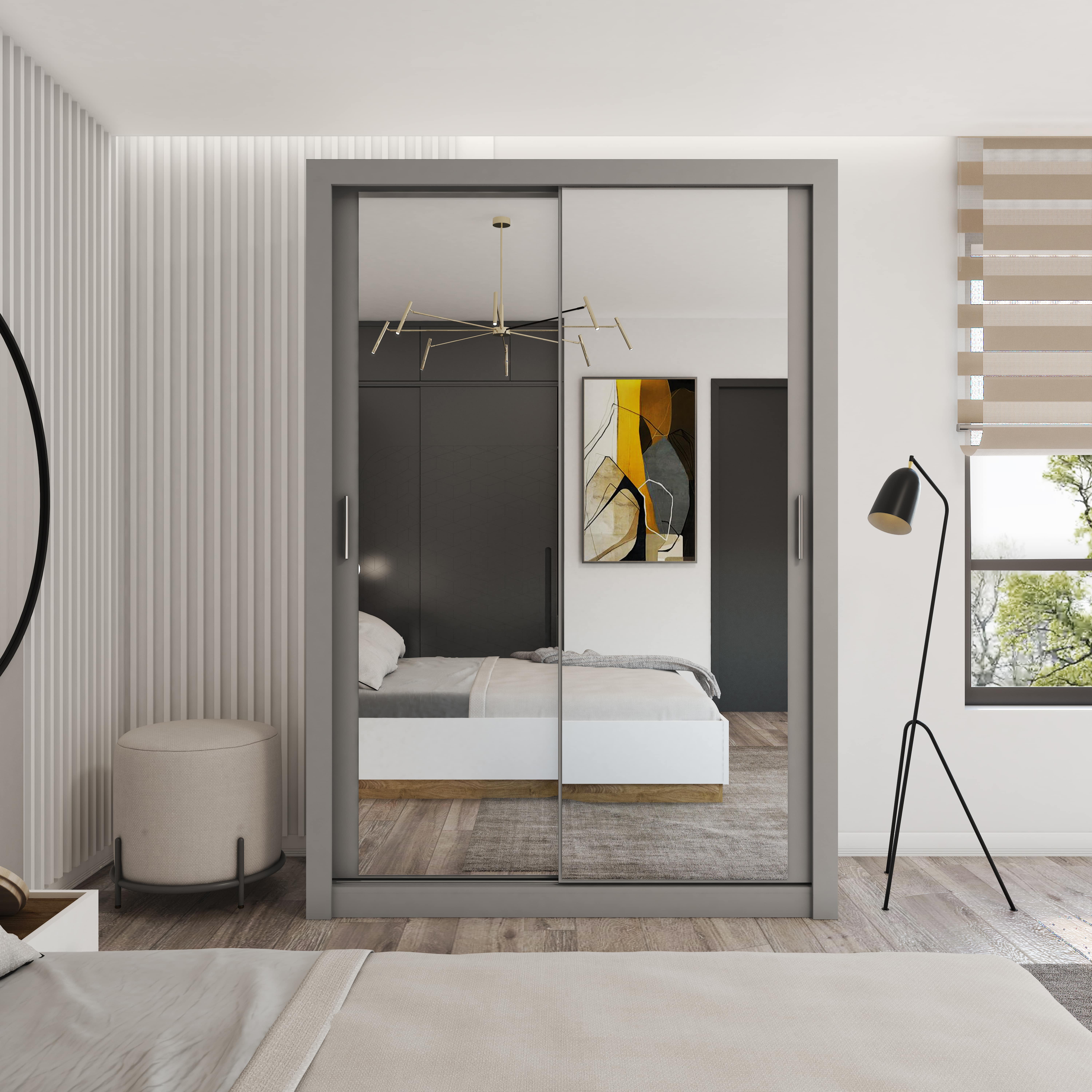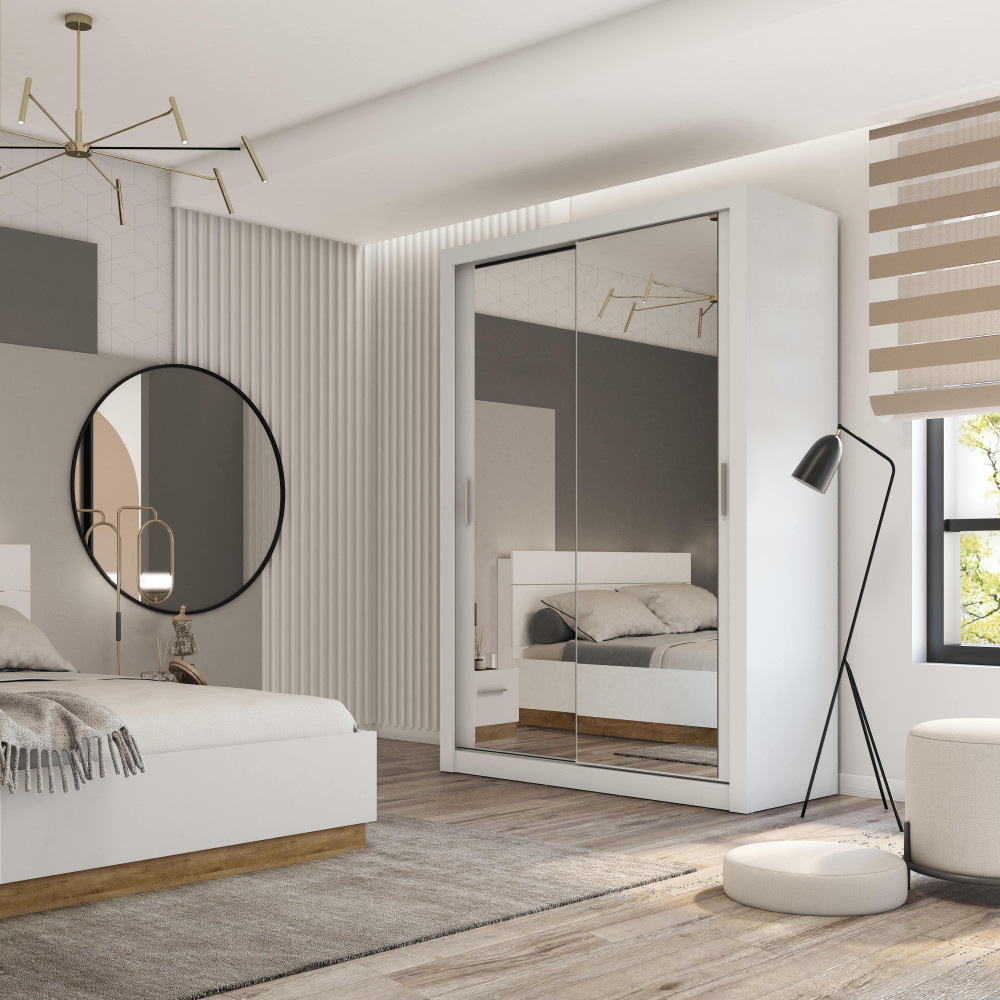 Szafa z dwojgiem drzwi przesuwnych, wyposażona w lustra na obu frontach, to elegancka i funkcjonalna propozycja do nowoczesnych wnętrz. Wewnątrz znajduje się drążek na wieszaki oraz wiele pojemnych półek, zapewniających wygodną przestrzeń do przechowywania odzieży i innych przedmiotów. Uniwersalny design, dostępny w kolorach białym, szarym oraz dąb shetland, łatwo wpisuje się w różnorodne style aranżacyjne.