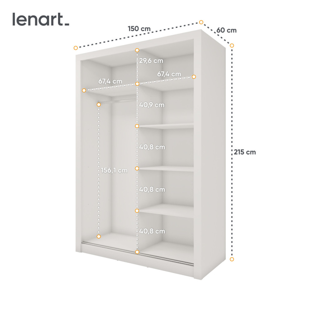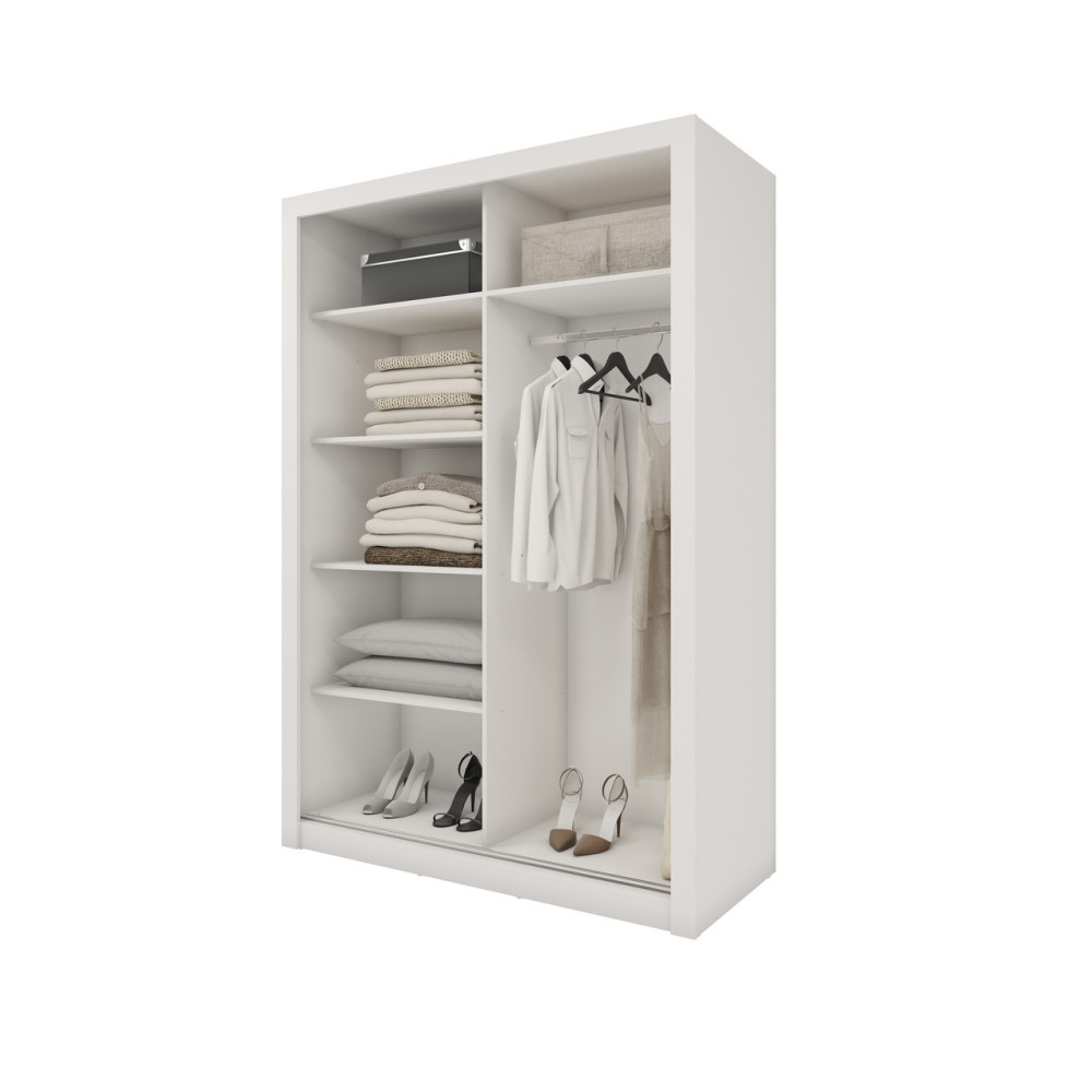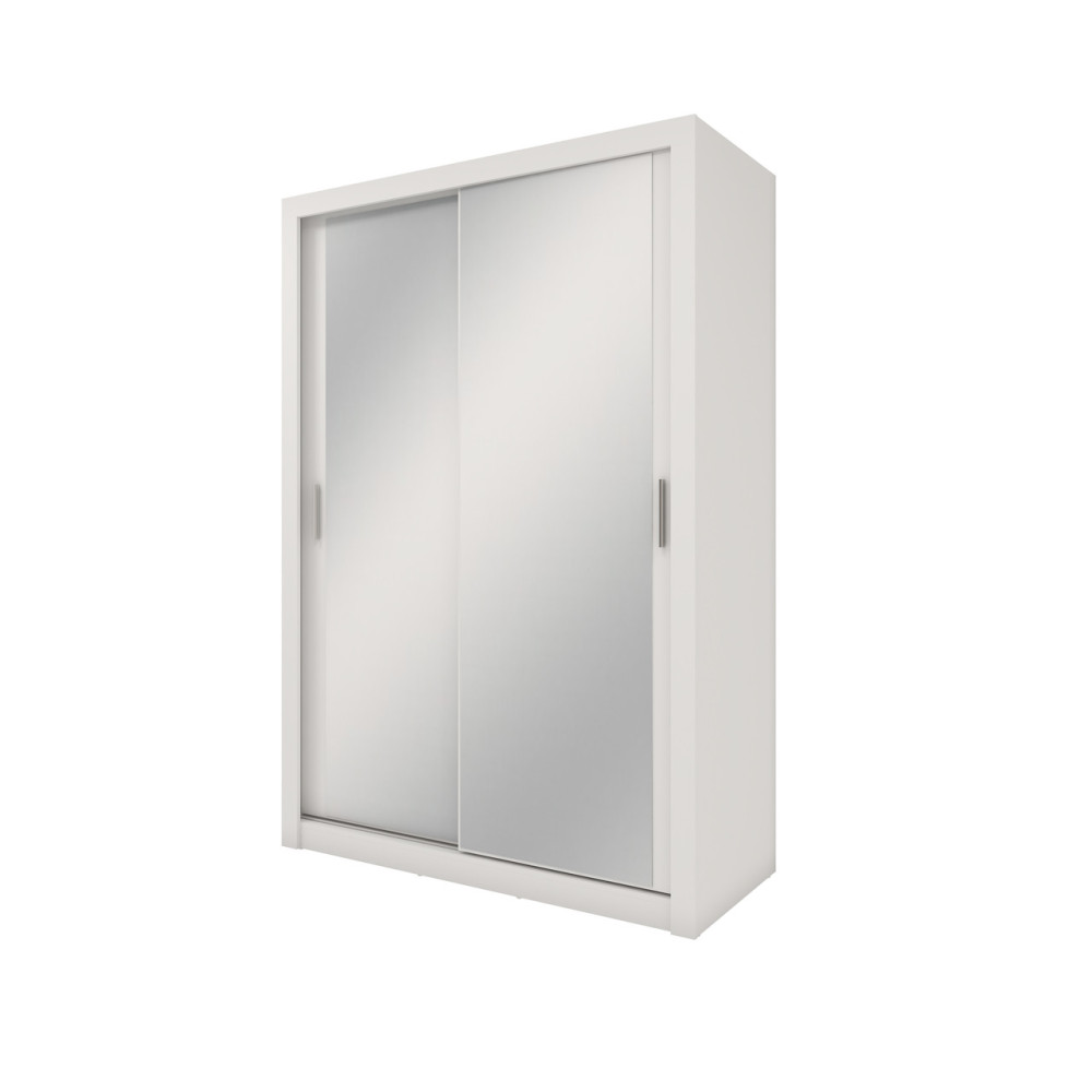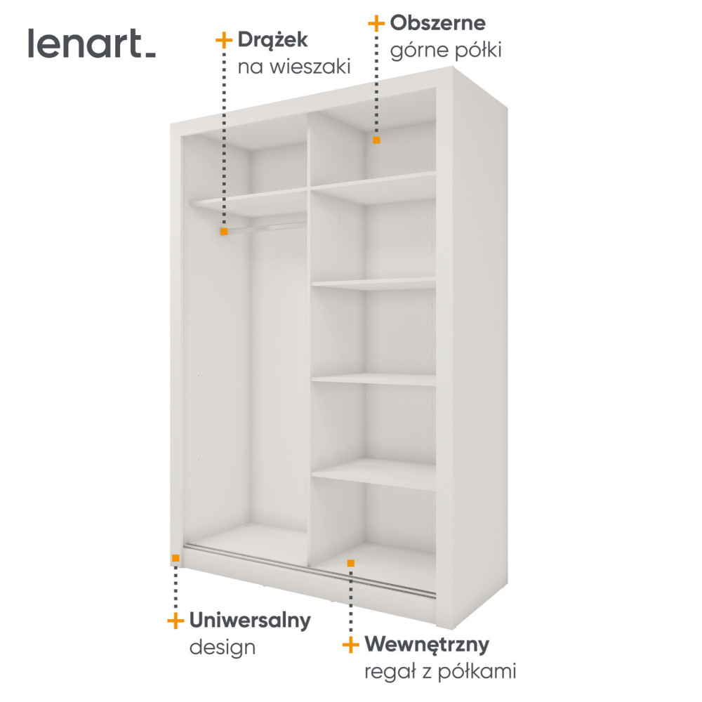 Szafa z dwojgiem drzwi przesuwnych, wyposażona w lustra na obu frontach, to elegancka i funkcjonalna propozycja do nowoczesnych wnętrz. Wewnątrz znajduje się drążek na wieszaki oraz wiele pojemnych półek, zapewniających wygodną przestrzeń do przechowywania odzieży i innych przedmiotów. Uniwersalny design, dostępny w kolorach białym, szarym oraz dąb shetland, łatwo wpisuje się w różnorodne style aranżacyjne.
