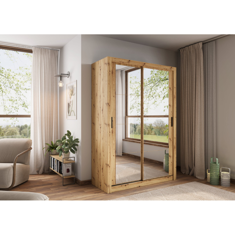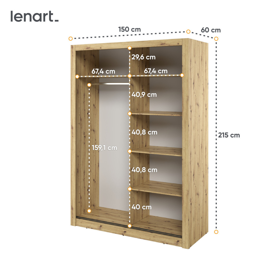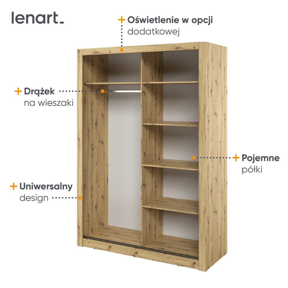 Dwudrzwiowa szafa to praktyczny i stylowy mebel, który doskonale sprawdzi się w różnych aranżacjach wnętrz. Wewnątrz szafy znajduje się drążek na wieszaki, idealny do przechowywania ubrań wiszących, takich jak płaszcze, sukienki czy koszule, oraz wygodny regał z pojemnymi półkami, które pomieszczą złożone ubrania, pościel lub akcesoria. Szafa wykonana jest z trwałej płyty laminowanej, wykończonej solidnym obrzeżem ABS, co zapewnia jej odporność na uszkodzenia i długą żywotność. Dostępna jest w czterech atrakcyjnych kolorach – białym, szarym, dąb shetland oraz dąb artisan – co ułatwia dopasowanie jej do różnych stylów wnętrz, od nowoczesnych po klasyczne.