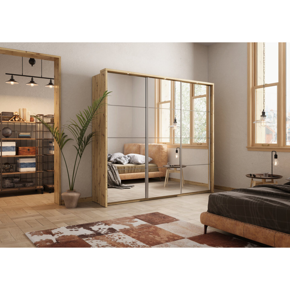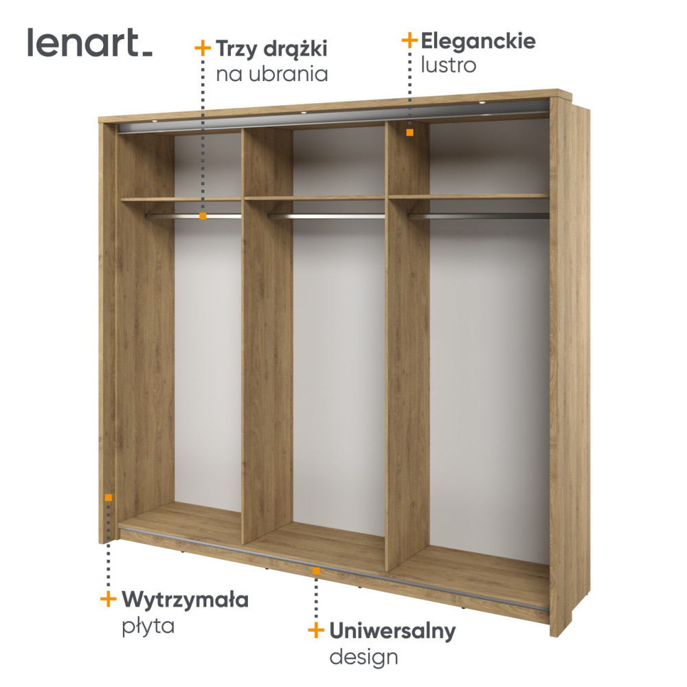 Przesuwna szafa z lustrem w kolorze dąb shetland stanowi funkcjonalny element wyposażenia, który optycznie powiększa wnętrze i dodaje mu elegancji. Lustrzane drzwi zapewniają wygodny dostęp do przestrzeni przechowywania, a jednocześnie odbijają światło, rozjaśniając pomieszczenie. Wykończenie w kolorze dąb shetland nadaje meblowi naturalny i stylowy charakter, pasujący do różnych aranżacji. Wbudowane oświetlenie w zestawie podnosi komfort użytkowania i eksponuje wnętrze szafy. Szafa łączy praktyczność z atrakcyjnym designem, wnosząc do wnętrza wyjątkowy akcent.
