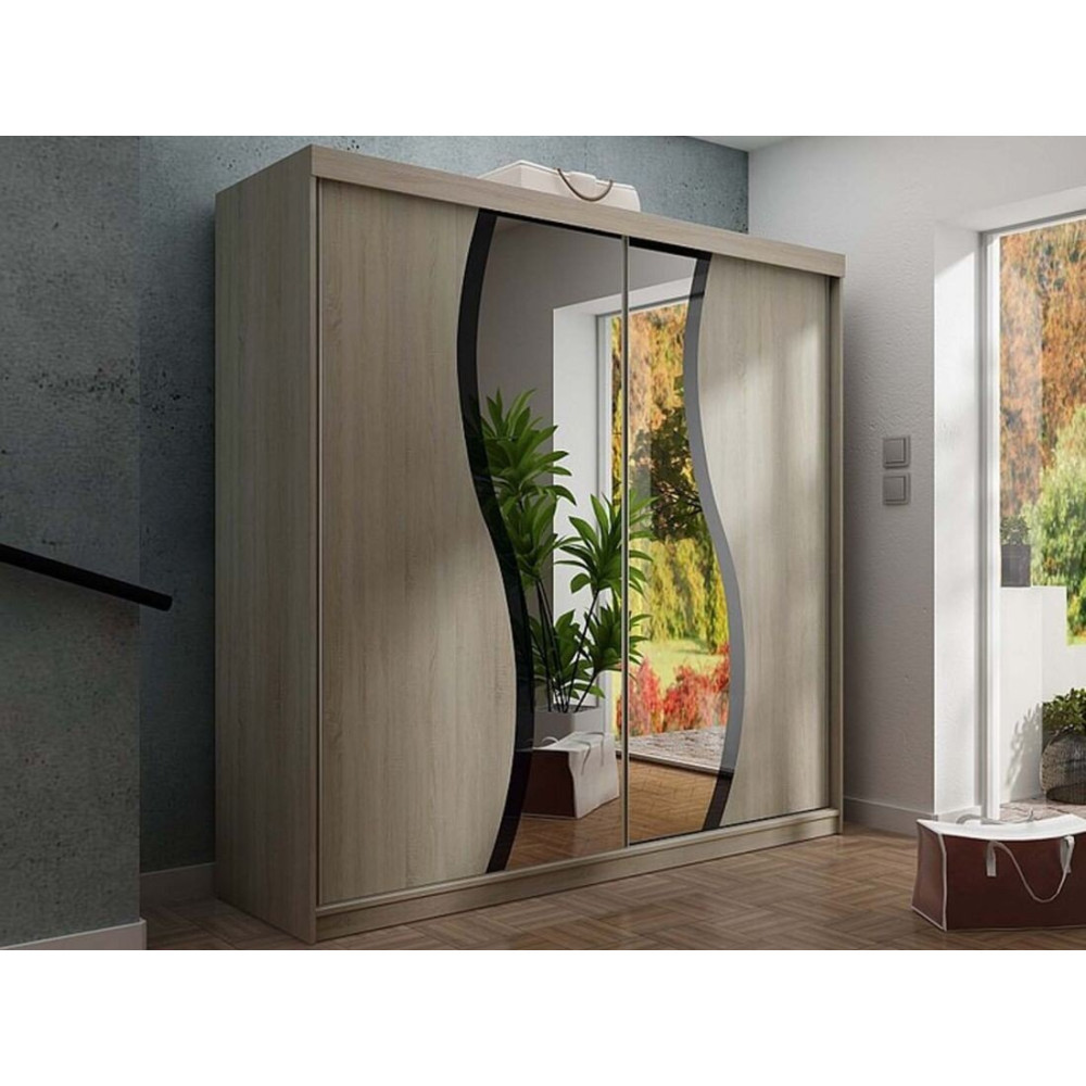 Szafa przesuwna z płyty laminowanej 16 mm. Szafa wyposażona jest w system jezdny zawierający aluminiowe prowadnice typu LAGUNA oraz kółka ułożyskowane