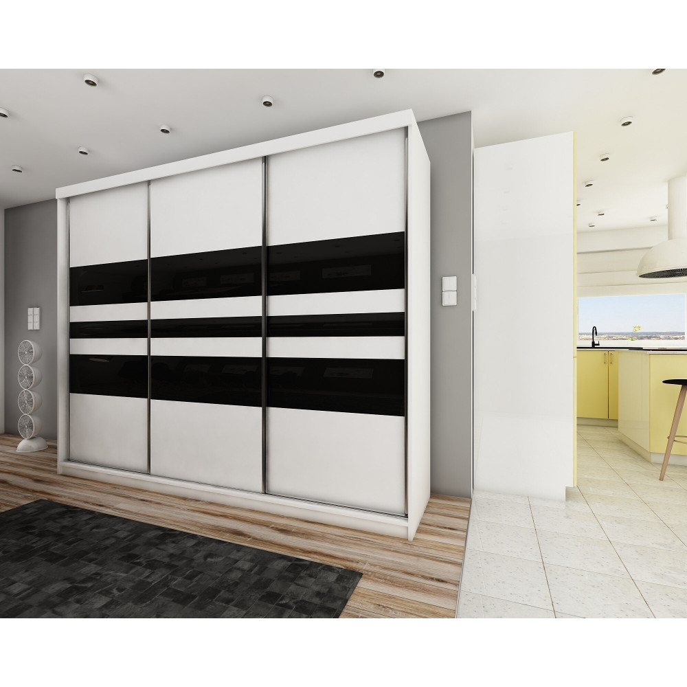 W skład zestawu wchodzą: korpus, półki, drążek, zestaw montażowy, fronty mat + wstawki lacobel.