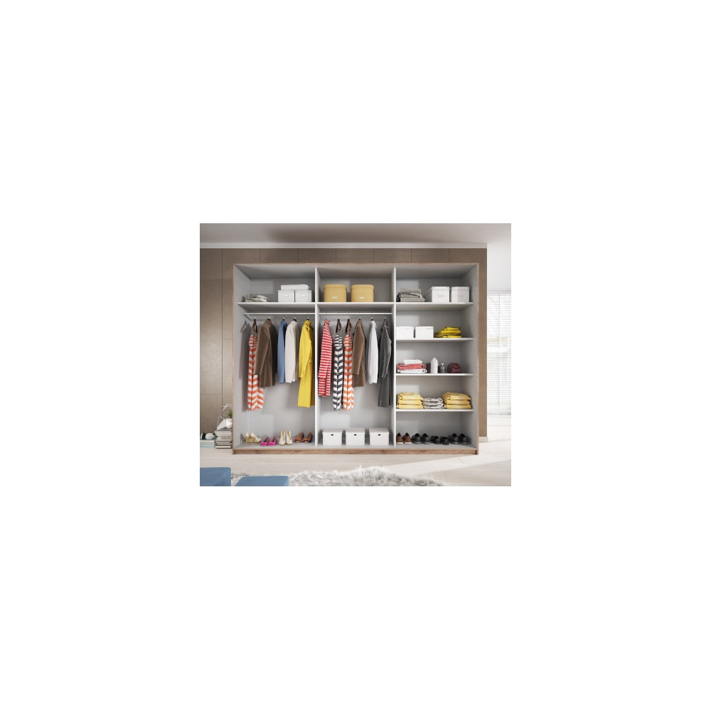 Szafa Lako podzielona została na trzy równe części. W dwóch częściach mamy półkę oraz drążek ubraniowy, natomiast w ostatniej znajdują się 4 półki.