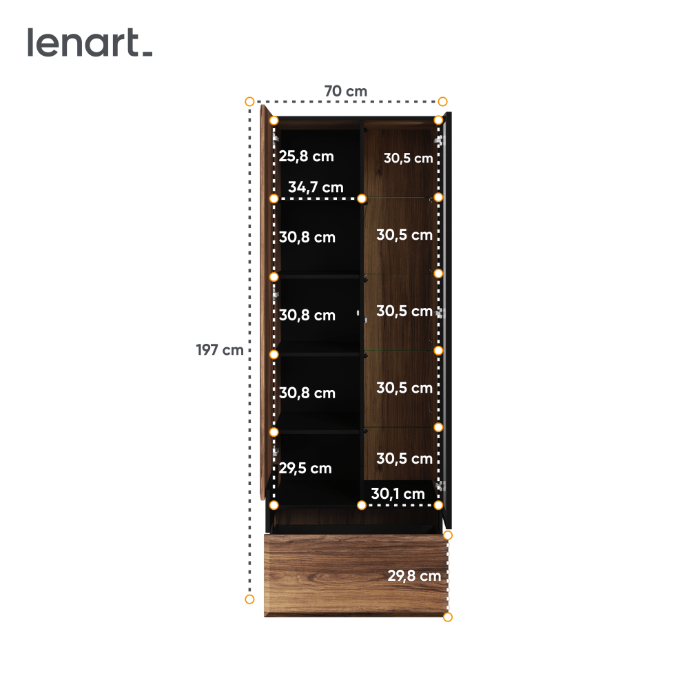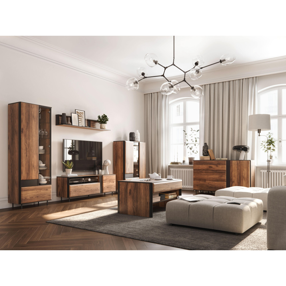 Mebel opiera się na smukłych nóżkach, a połączenie czerni z ciemnym drewnianym dekorem wprowadza do wnętrza przytulny klimat. Wykonany z trwałej płyty laminowanej z obrzeżami wzmocnionymi ABS oraz solidnej płyty MDF.